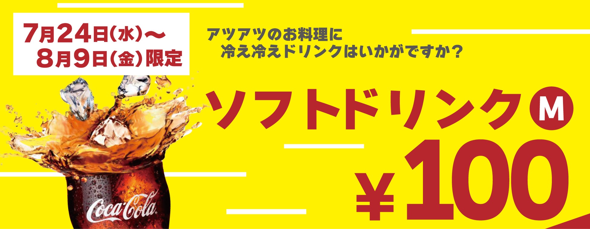 ◆実施内容:期間中、ソフトドリンク(M)を100円(税込)で販売いたします。