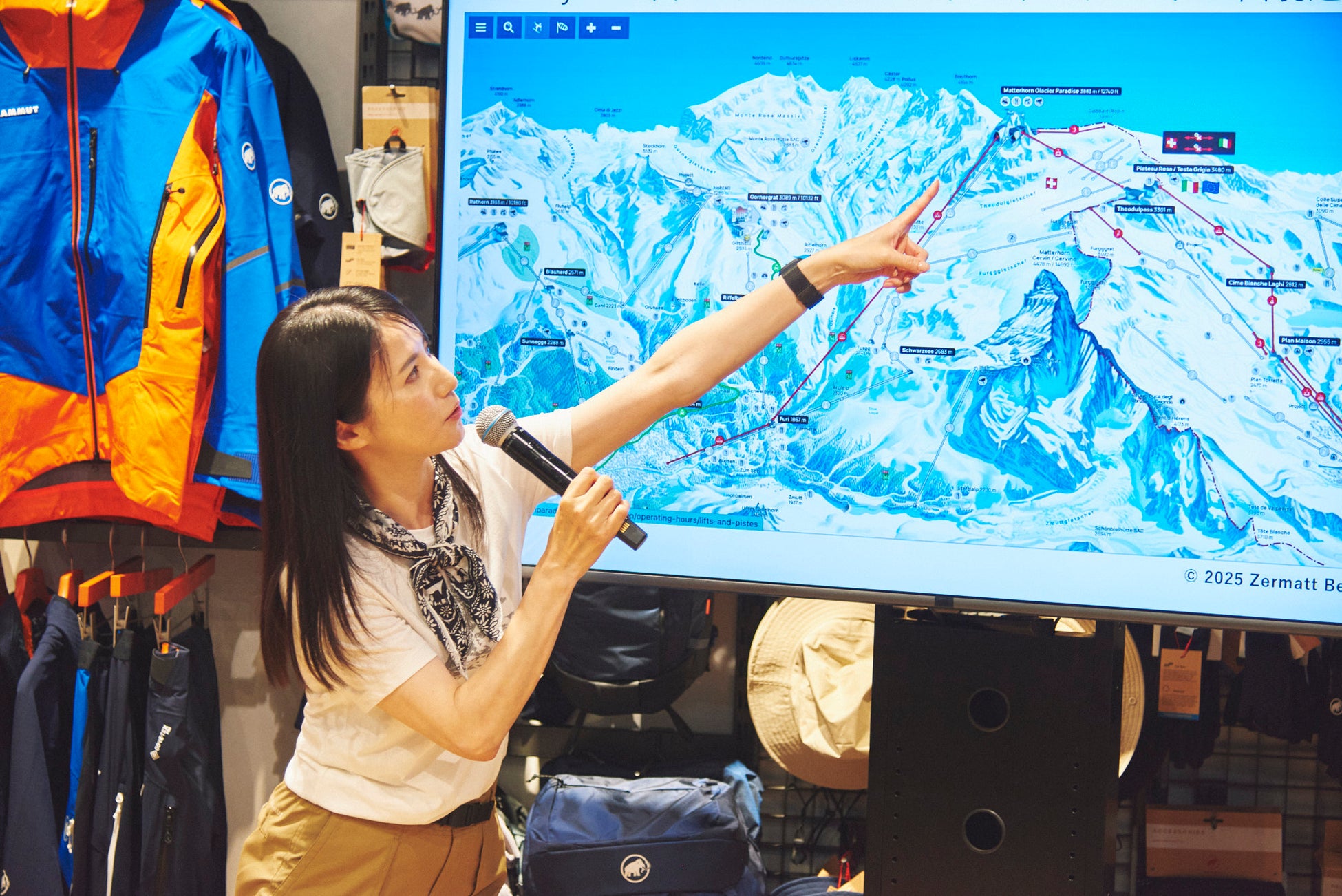 今回のコラボレーションシューズのローンチイベントが行われたスイス・アルプス観光の王道であり、名峰マッターホルンを抱く山岳リゾート「ツェルマット -Zermatt-」。山下さんは、ローンチイベントに日本から唯一参加しており、実際のイベント風景を影像と写真を交えながら、スイスの魅力とともに発信してくれました。イベントでは、約100年前から始まったスイスとイタリアの二国を結ぶ国境越えのロープウェイをつくる、夢の構想でもあったマッターホルン・アルパイン・クロッシングを体験。2023年に完成したこのロープウェイでは、氷河を越えて国境も越えるという乗車自体が特別なアトラクションですが、今までスキーでしか行くことができなかったイタリアのチェルヴィニア村へロープウェイで向かい、ショッピングやランチをしてスイスに戻ってくることもできます。実際にロープウェイに乗って、イタリアの国境越えを体験した山下さんは「パスポートも必要なくて、どんな方でも富士山より高い所行ける特別な体験は山岳大国のスイスならではです」と語ってくれました。