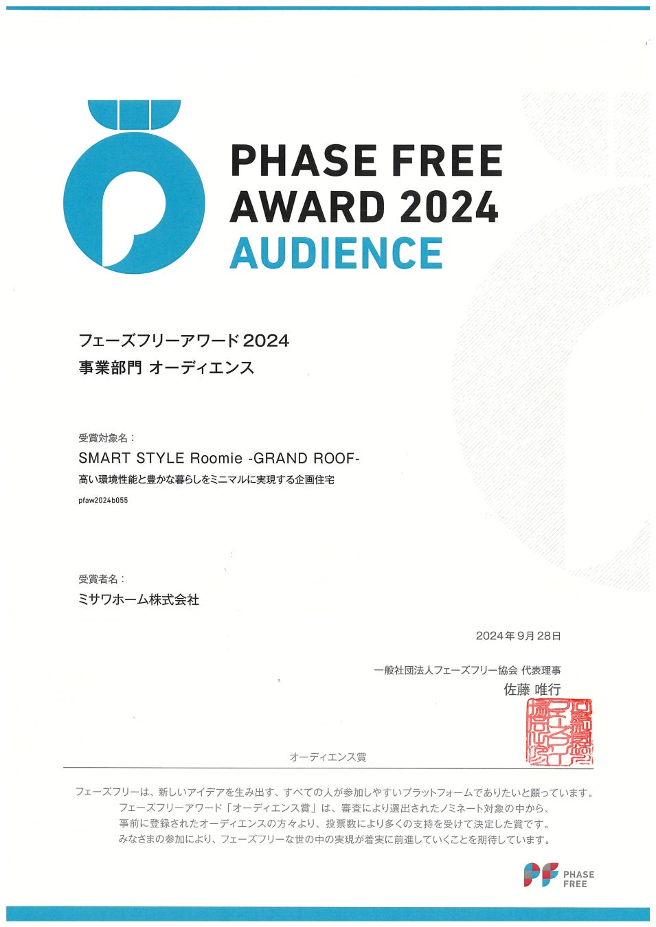 ミサワホーム株式会社(代表取締役社長執行役員 作尾徹也)は、「PHASE FREE AWARD2024」(主催︓一般社団法人フェーズフリー協会)において、戸建住宅「SMART STYLE Roomie 大屋根タイプ」が事業部門でAudience賞を受賞しましたのでお知らせいたします。戸建住宅として同賞の受賞は初となります。
