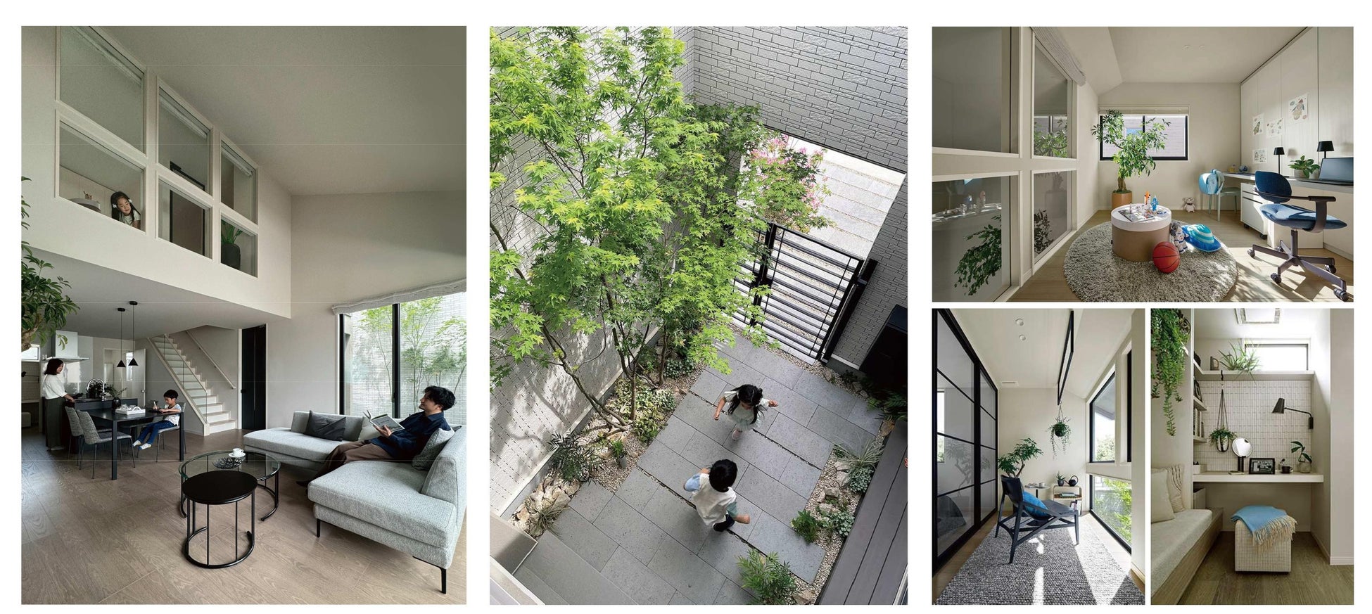 「SMART STYLE Roomie 大屋根タイプ」は、家族の集まる1階を広く確保し、1枚の大屋根で上下階をつなぐことで、コンパクトながら開放的な内部空間と同時にLCCM基準の発電量を確保。エネルギーの利活用により日常の快適性と安全性を高めつつ、停電時にも日常生活に近い暮らしを可能にします。玄関アプローチに設けた自然(光・風・緑)を取り込む中庭空間は、安全性やプライバシーを確保しながら、外での多様な活動に導き、地域とのコミュニティや災害時の助け合いのきっかけを創出。環境性能の高いモデルを規格化し、汎用性を高めるとともに、機能特性を生かすことで生まれるデザインや暮らしのベネフィットを具現化することで、環境価値やレジリエンスの高い住まいの普及を目指しました。