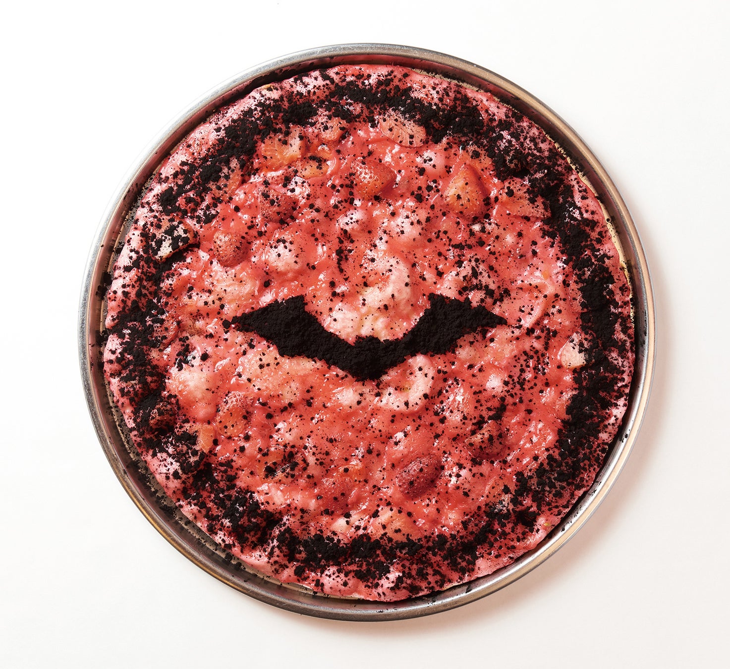 映画『THE BATMAN-ザ・バットマン-』とのコラボピザは、バットマンのシンボルである〈バットシグナル〉をココアパウダーで描きました。夜空に浮かぶ〈バットシグナル〉を表現しています。