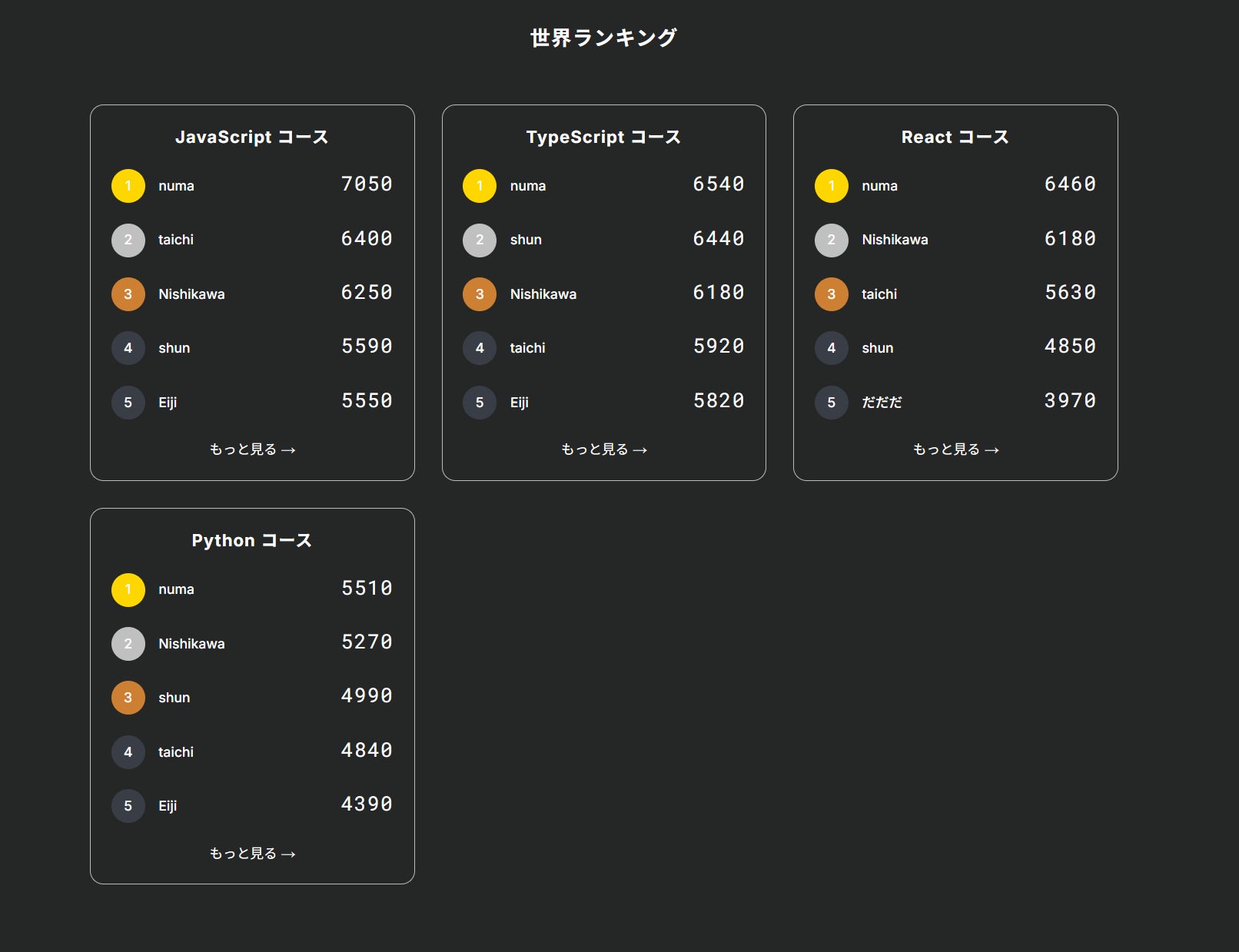 JavaScript・TypeScript・React・Python などの言語ごとに特化してタイピングの練習を行うことができます。