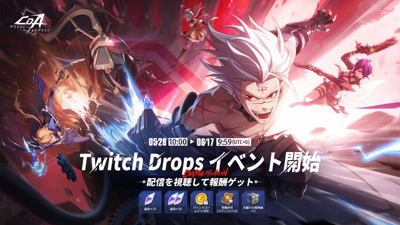 5/28(水)から6/17(火)Twitchで『クリスタル・オブ・アトラン(CoA)』関連の配信を視聴して、ゲーム内アイテムをゲットできるイベントが開催中です。