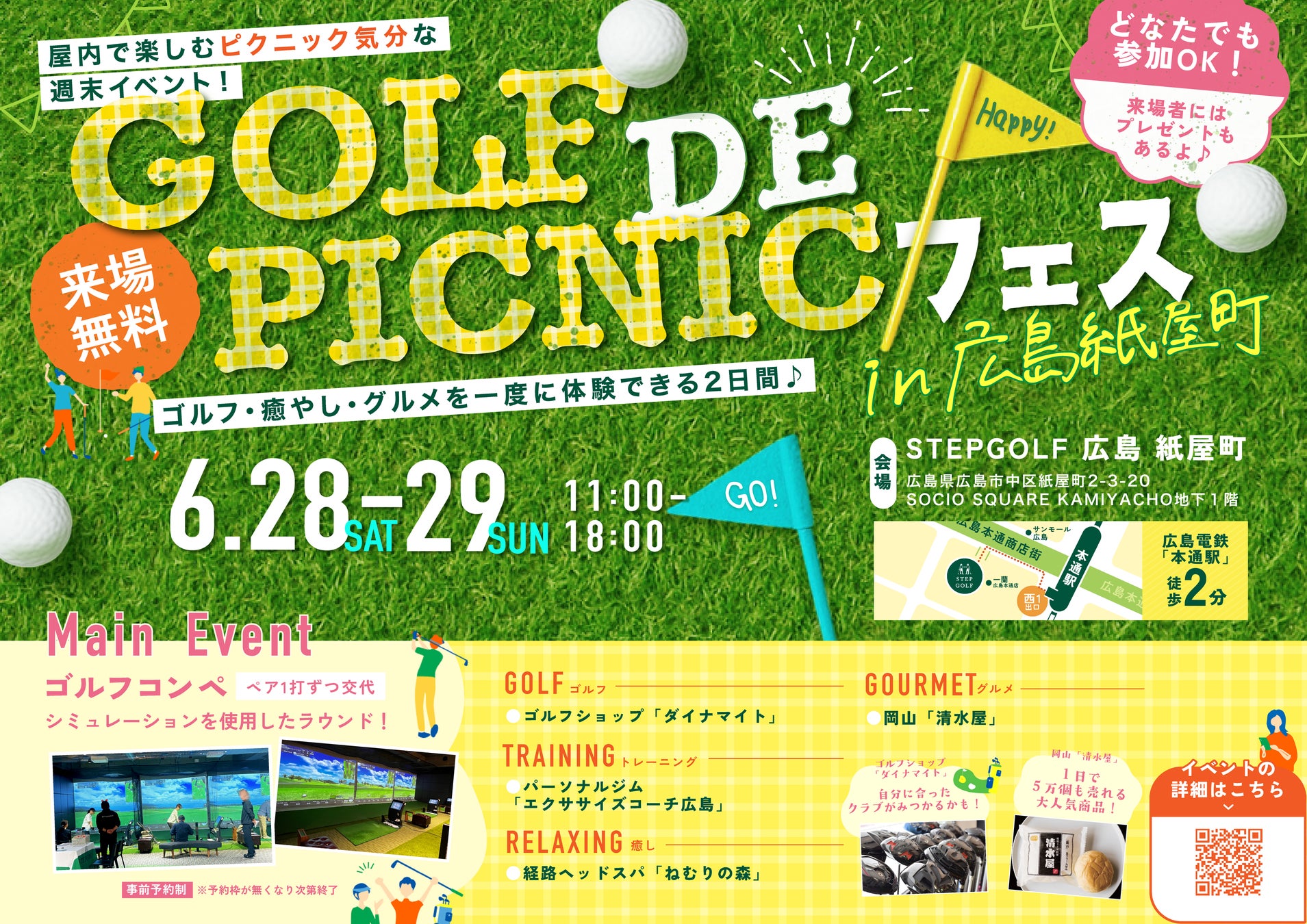 全国133店舗のインドアゴルフスクール「ステップゴルフ」を運営するステップゴルフ株式会社(本社:東京都渋谷区、代表取締役:榎本考修 以下、ステップゴルフ)は、「STEPGOLF 広島 紙屋町」にて、広島県のゴルフ人気とウェルビーイング向上を目的とした屋内イベント『GOLF DE PICNICフェス in 広島紙屋町』を6月28日(土)と29日(日)に開催することをお知らせいたします。