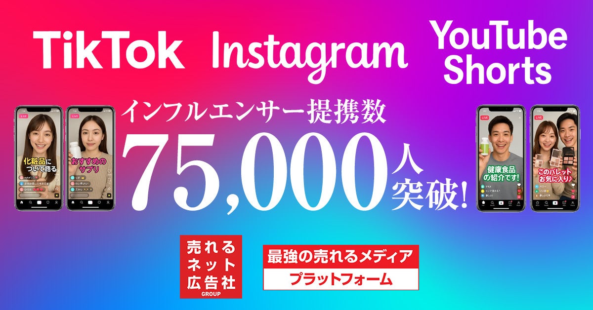 売れるネット広告社グループ、「最強の売れるメディアプラットフォーム」におけるインフルエンサー提携数“75,000人突破”!~完全成果報酬型ネットワークで、D2Cマーケティング市場“シェア拡大”へ~
