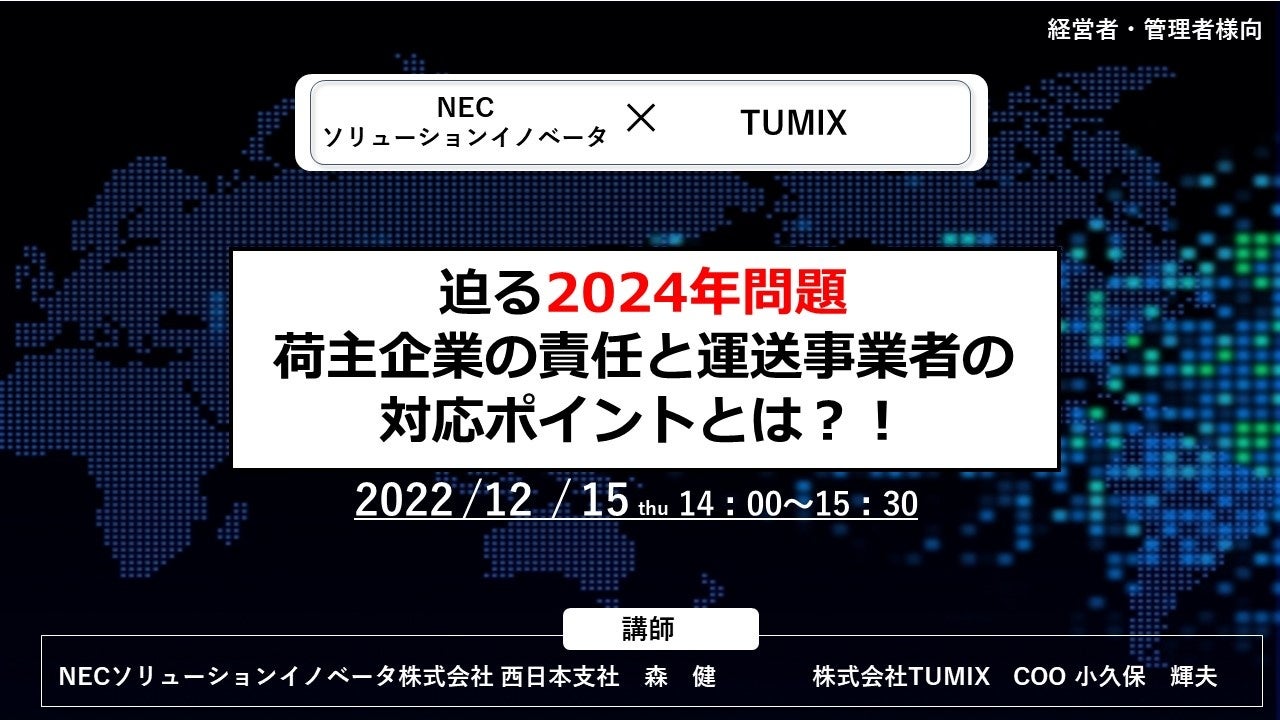 【2024年問題対策無料セミナー】株式会社TUMIXがNECソリューションイノベータと12/15(木)に共催セミナーを開催