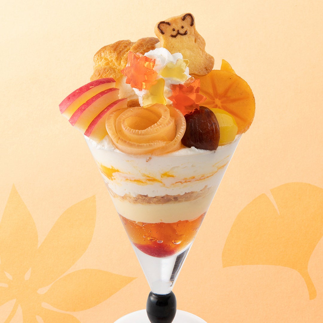 リスやくま、どんぐりなどの可愛らしい焼き菓子のパフェや、紅葉をイメージした色合いのパフェなど、店舗ごとに異なるデザインです。