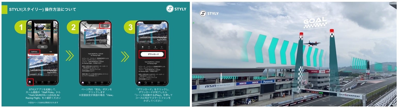 場内でAIR RACE X デモフライトをより楽しめるよう、スマートフォンアプリ「STYLY」でデジタルパイロンを出現させることが可能です。イベント当日デモフライトに合わせてアプリケーション内の専用ページが立ち上がりますので、事前のアプリインストールを推奨します。