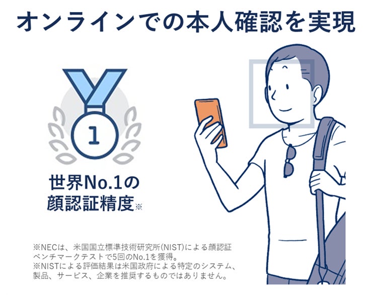 「Digital KYC」には、NECの生体認証「Bio-IDiom」(注2)の中核技術であり、世界No.1の認証精度(注3)を有する顔認証AIエンジン「NeoFace」(注4)を活用しており、本人確認手続きにおける本人以外の不正利用のリスクを低減します。