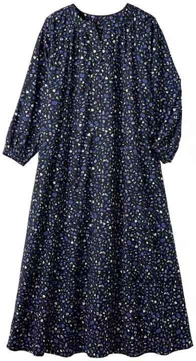 たっぷりのギャザーと手首が華奢に見える丈のふんわり袖。キーネックのあきと小ぶりのループボタンで顔まわりがすっきりと見えます。ディテールにギャザーを取り入れているため体への締めつけ感が少なく様々な体型に対応。大人かわいく、ふんわりとしたシルエットに繊細な柄が映えるワンピースです。