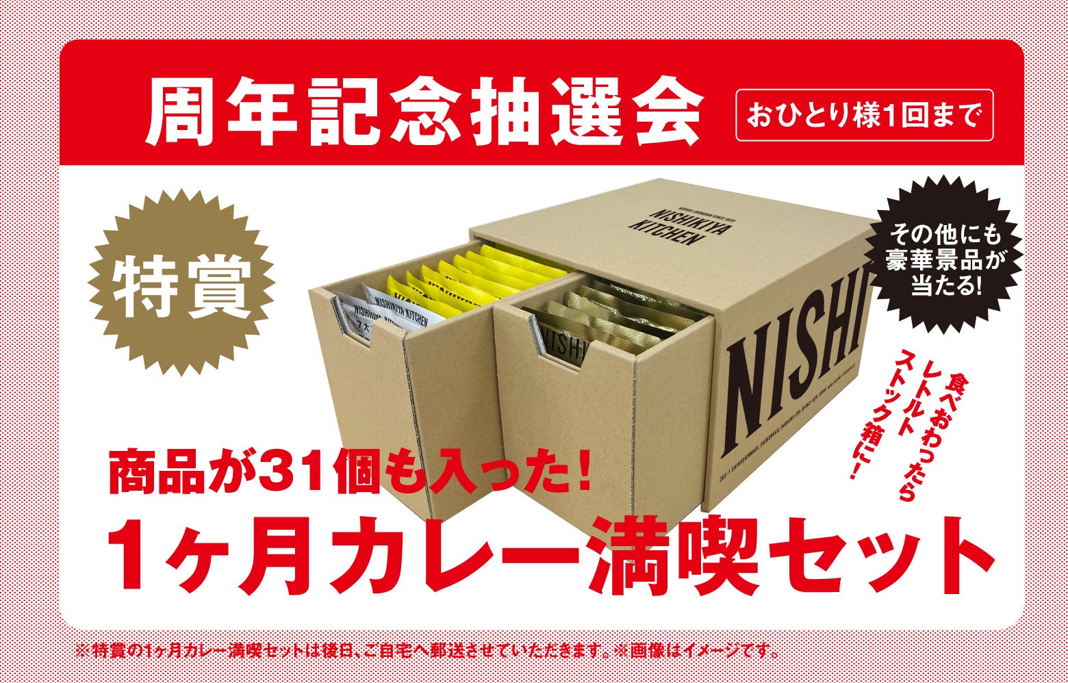 期間中、豪華商品が当たる抽選会を開催します。特賞はニシキヤキッチンの商品が31個も入った「1ヶ月カレー満喫セット」が当たります。食べ終わった後も、レトルトストック箱としてご利用いただける特別なケース付きです。他にも豪華景品が当たります。