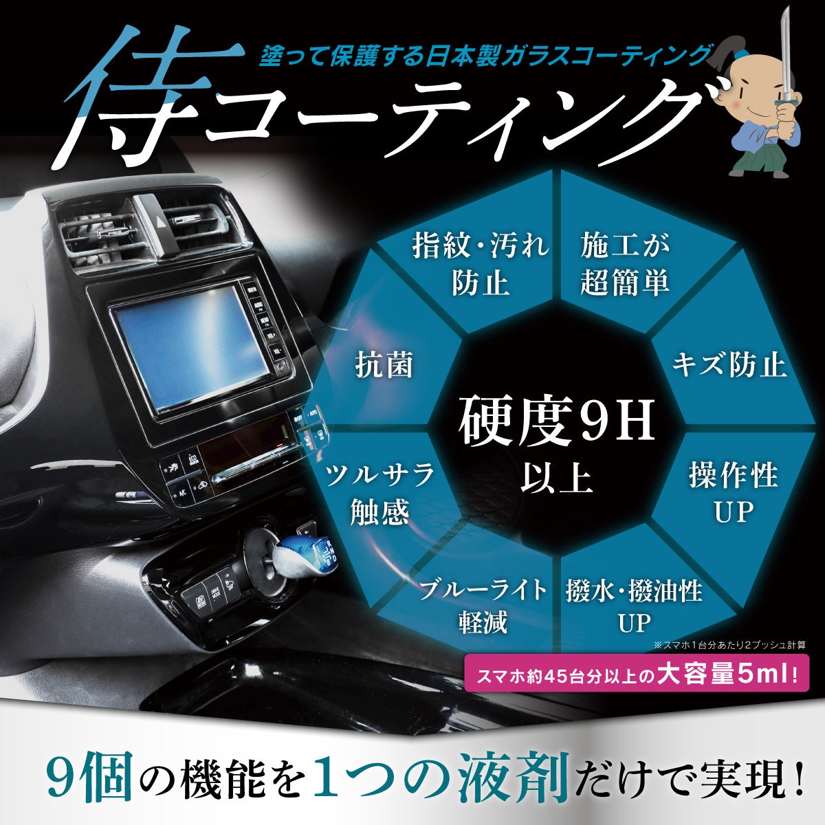 侍コーティングは9個の機能を実現したスプレータイプの硬度9H液体コーティング剤です。アイフォンなどの携帯電話へ、ショップと比べて安い値段で施工可能。指紋防止や保護、抗菌効果もお求めの方におすすめ!