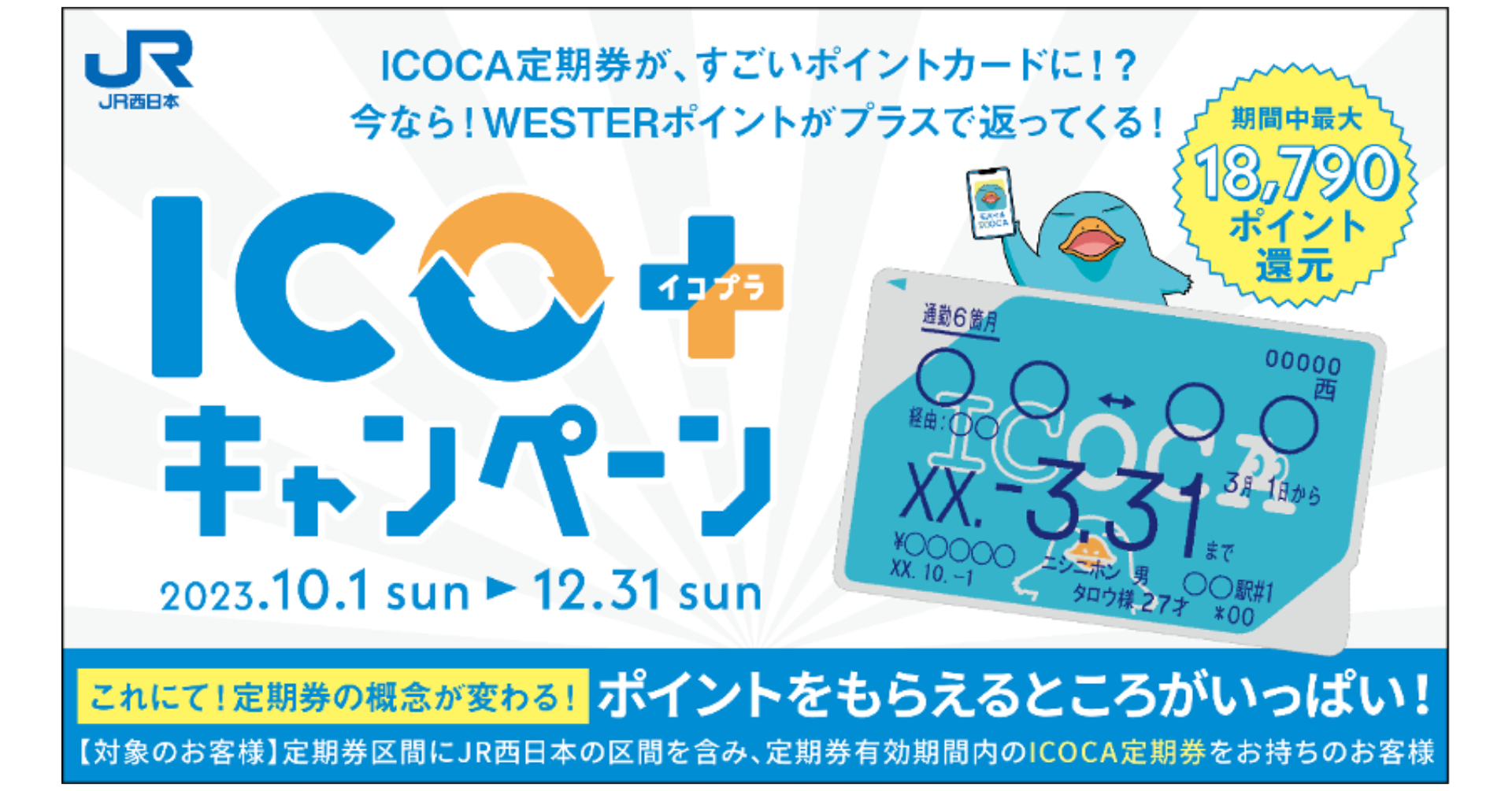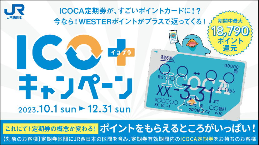株式会社ギックス(本社:東京都港区、代表取締役 CEO 網野 知博、以下「ギックス」)が提供する商業施設・観光事業向けキャンペーンツール「マイグル」を活用し、西日本旅客鉄道株式会社(本社:大阪府大阪市、代表取締役社長:長谷川 一明、以下「JR西日本」)が2023年10月1日(日)~12月31日(日)にICOCA定期券をお持ちの方を対象に実施する、JR西日本グループのサービスをおトクにご利用頂けるキャンペーン「ICO+(イコプラ)」に採用されたことをお知らせいたします。