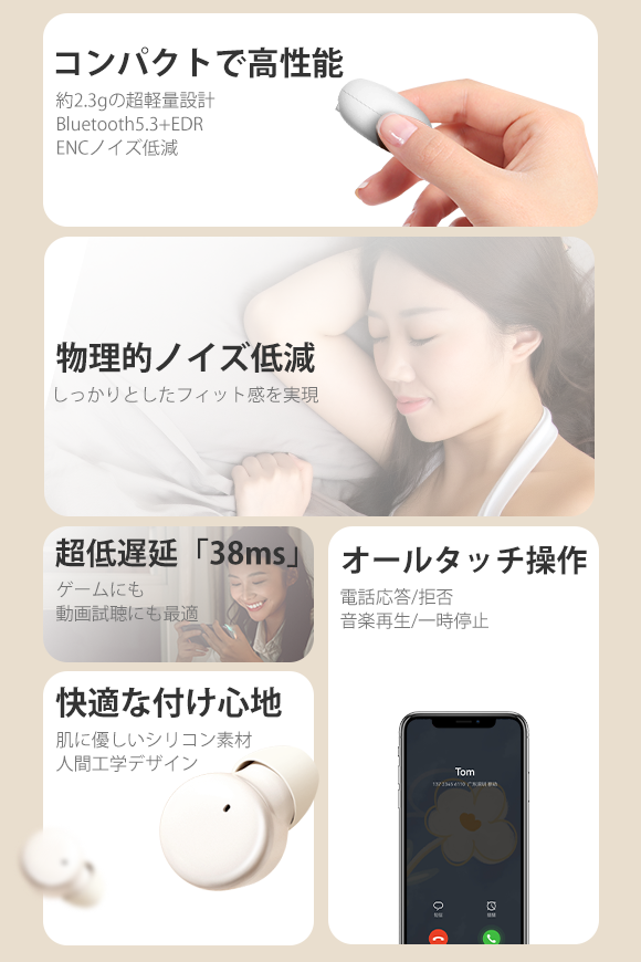 - 睡眠用にとどまらず、音楽にも通話にも最適