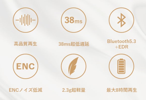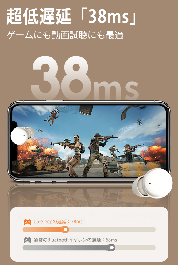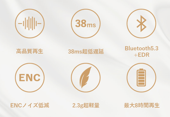 ・Bluetooth5.3+EDR搭載、38ms超低遅延、低消費電力、10mの長距離通信。