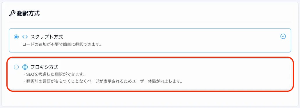 今回追加された「プロキシ翻訳機能」は、従来のスクリプト翻訳方式に加え、プロキシ型にも対応することで、より柔軟で実用的な多言語サイト運用が可能となります。
