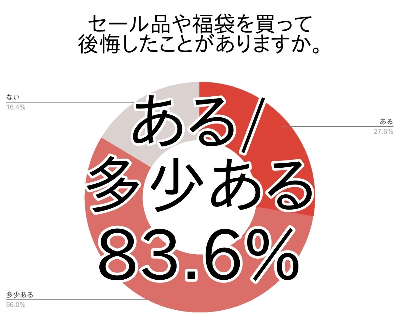 アンケートでは、セール品や福袋を買って後悔したことが少しでもあると答えた方は約8割(関東83.6%・全国81.0%)でした。セールや福袋で後悔したことがない方はわずか2割に満たないことがわかり、多少なりとも苦い経験がある方が大多数のようです。