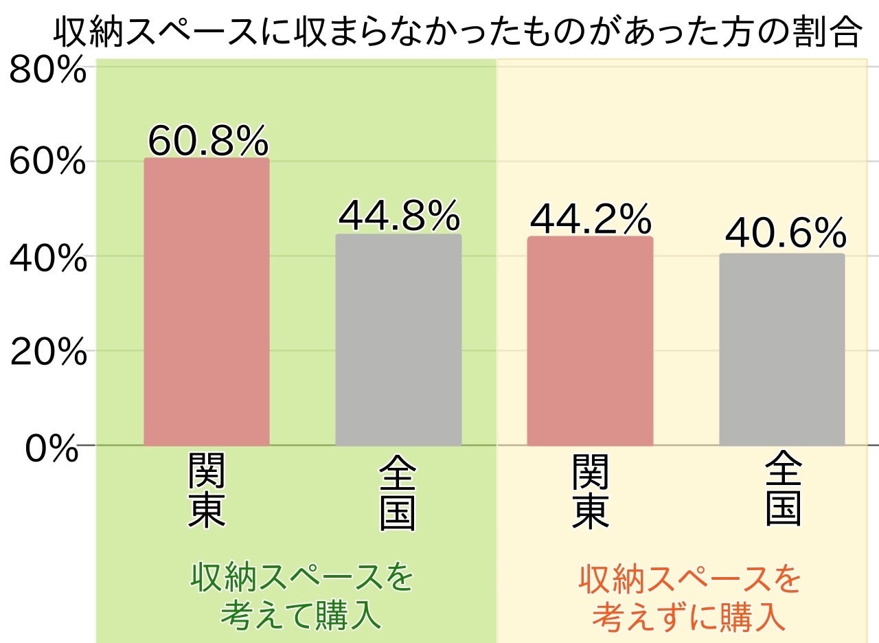 少し意外かもしれませんが、関東・全国とも収納スペースを考えて購入した場合のほうが、考えずに購入した場合より収納スペースに収まりきらない割合が高い結果となり、特に関東では収納スペースを考えて購入しても約6割の方が収納スペースに収まりきらなかったことがわかりました。