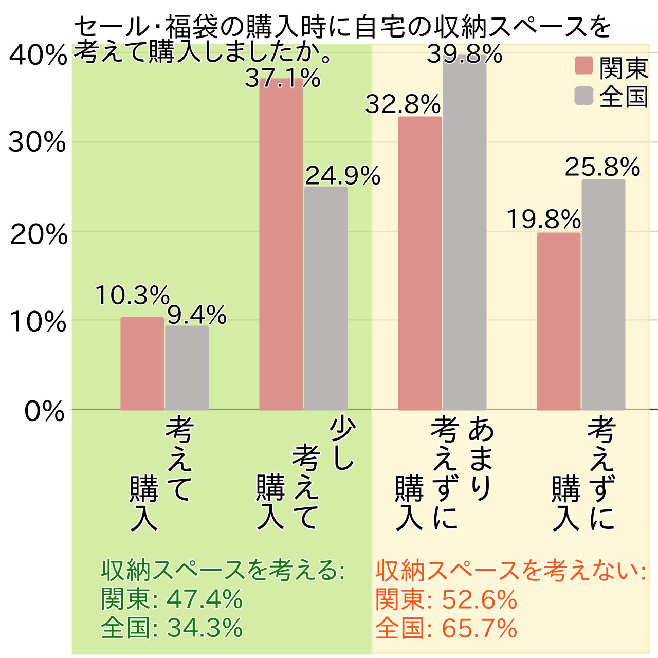 つまり、セール・福袋購入などの際に収納スペースを考えて購入した方の割合が関東で特に多かった背景には、収納スペースが限られるために意識せざるを得ない状況が影響しているといえそうです。