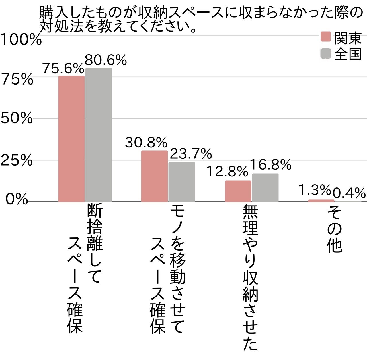 最も多かったのは「断捨離してスペース確保」で約8割で突出していました。次に多かったのは「モノを移動してスペース確保」で関東約3割・全国約2割でした。また、「無理やり収納させた」も1割台でした。