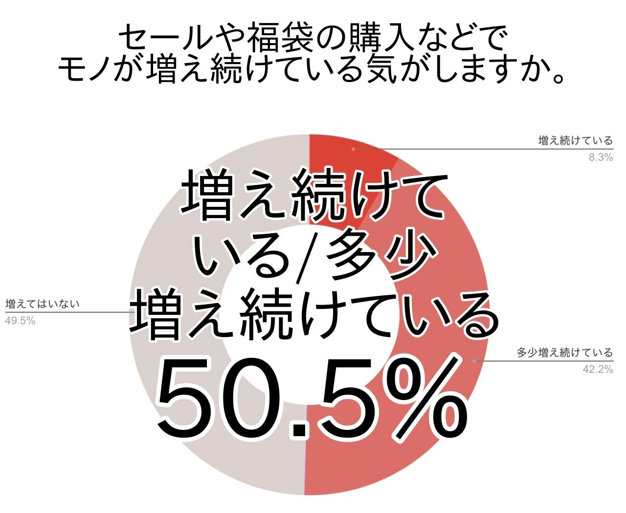 アンケートでは、セールや福袋の購入などでモノが増え続けている・多少増え続けていると答えた方は約5割(関東50.5%・全国53.5%)でした。
