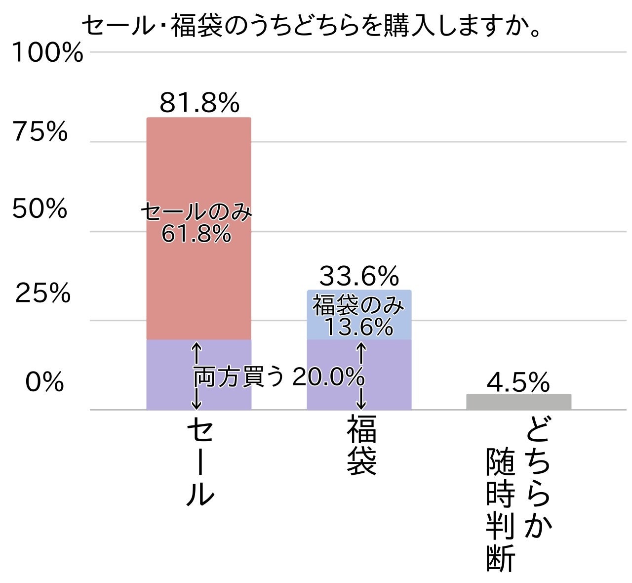 セール・福袋の購入内訳は、(関東・全国とも)セール派が約8割・福袋派が約3割で、うち両方買う方は全体の約2割でした。また、その時のラインナップによってセールまたは福袋を随時判断する方も約5%でした。