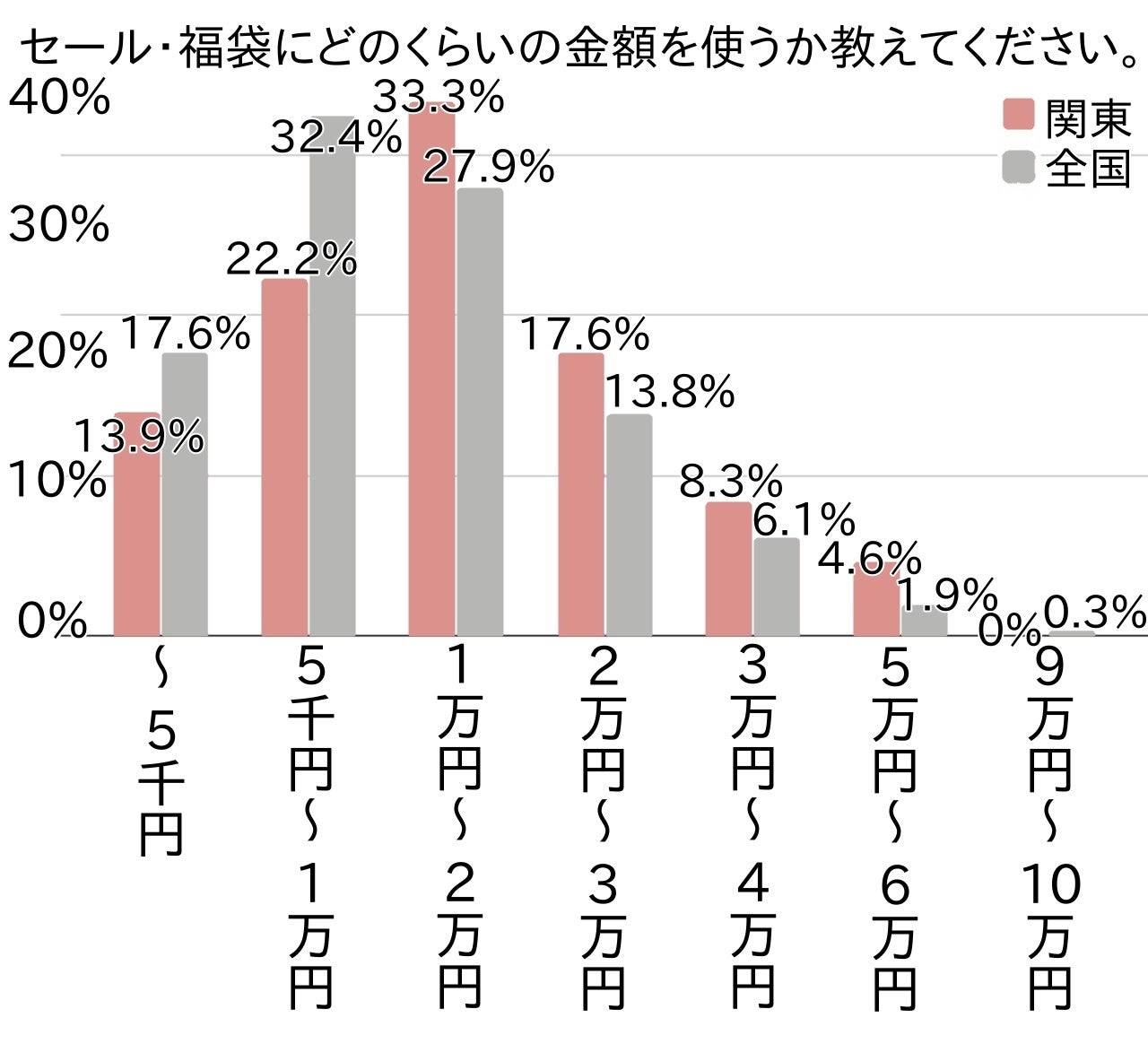 関東は全国よりセール・福袋に使う金額が高めでした。全国では1万円までにおさまる方が半数、2万円までが約8割でしたが、関東では1万円までは4割より少なく、2万円までは約7割でした。3万円までの区切りで比較すると、関東が約5%低いものの、関東・全国とも約9割でした。