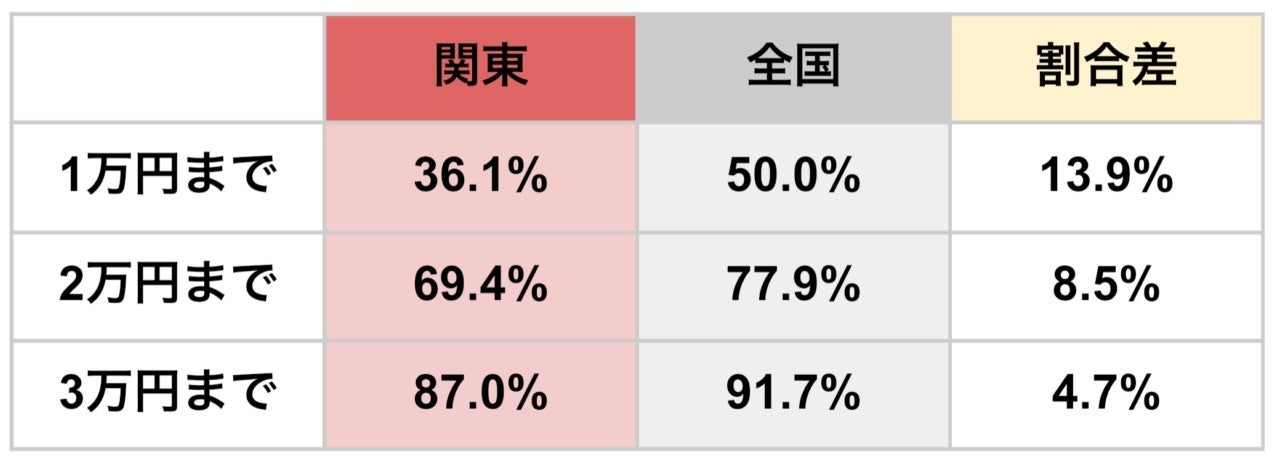 関東では「1万円〜2万円」が最多、全国では「5千円〜1万円」が最多でした。この2つの値段帯が全体の約6割(関東55.5%・全国60.3%)をしめました。
