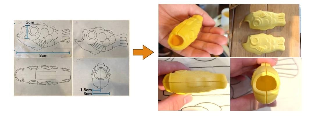 「のどぐろ」の特徴を活かしつつ、かわいらしいデザインを設計し、錦榮堂と取引のある石川県金沢市の加賀種食品工業にオリジナル金型を発注しました。金型の設計図も学生がデザインを行い、「のどぐろ」らしさを表現しています。