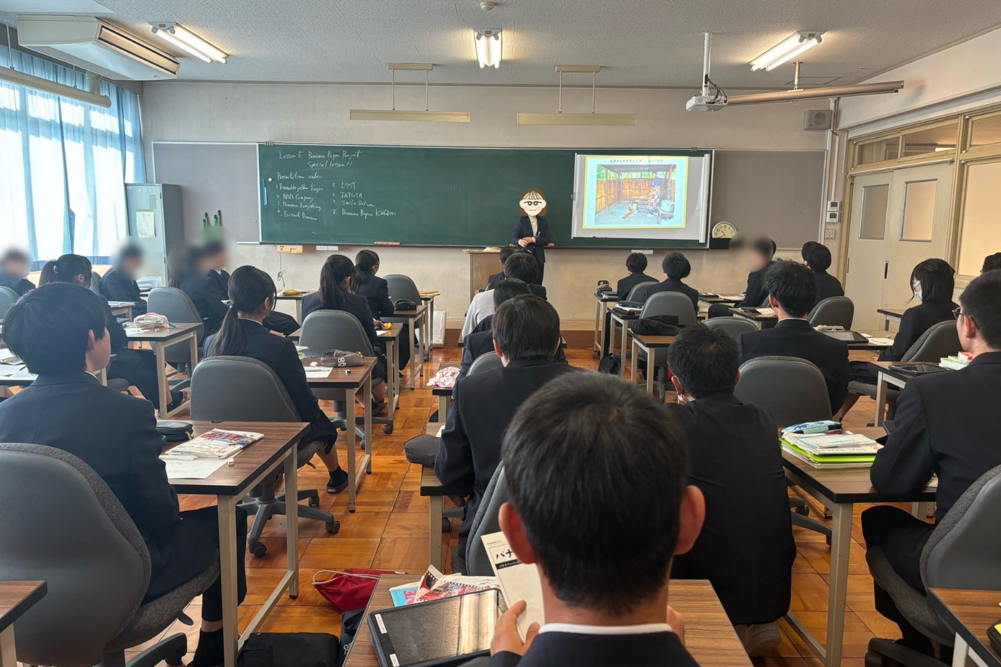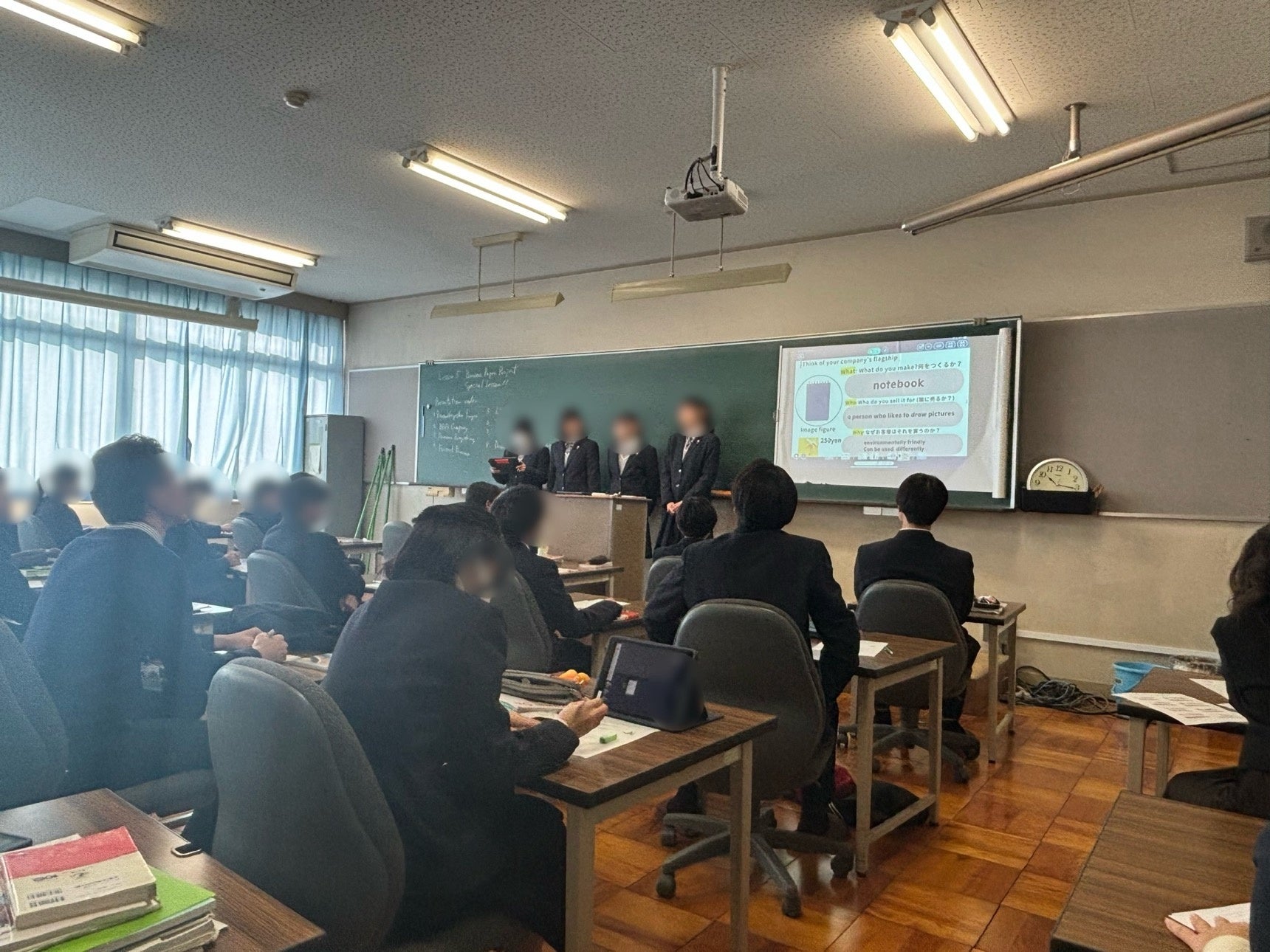 今回のプレゼンテーションは、京都すばる高等学校企画科の英語授業の一環で実施。「せっかくのプレゼンテーションなので、ぜひ、企業の方に聞いていただきたい」というご依頼を受け、高速オフセットのサステナブル紙研究チーム「KAMIKEN」メンバーが現地へ訪問しました。