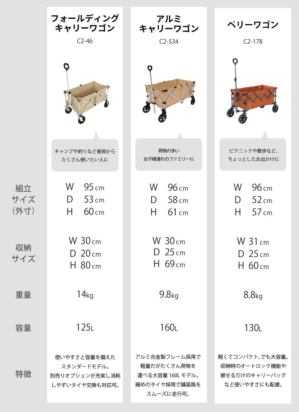 「ペリーワゴン」は、2017年より販売しているロングセラー「フォールディングキャリーワゴン」と比較して積載容量は130Lに拡大しながらも約5.1kgの軽量化と収納サイズも高さで約3/4にまでコンパクトに圧縮。