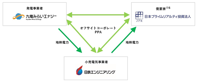 九電みらいエナジーが所有する4か所の地熱発電所(八丁原発電所(大分県玖珠郡九重町)、滝上発電所(同左)、山川発電所(鹿児島県指宿市)、大霧発電所(鹿児島県霧島市))で発電した再エネを、小売電気事業者である日鉄エンジニアリングを通じて、需要家であるJPRが東京都内に保有するオフィスビル(中野セントラルパークイースト(東京都中野区))に供給します。