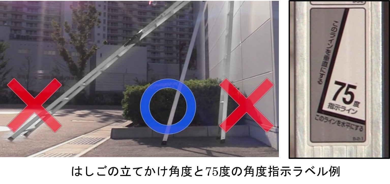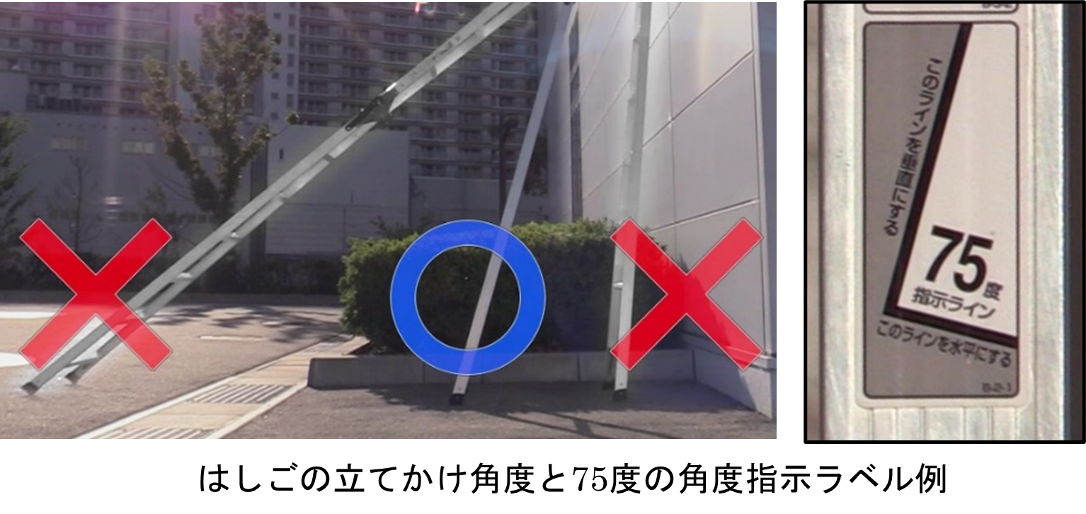 なお、はしごを立て過ぎると使用者が背中から転落し、寝かせ過ぎるとはしごの脚部が後方に滑って使用者が前方に転落するおそれがあります。はしごの側面に表示されている「角度指示ラベル」を参考に、立て掛け角度は約75度にしてください。