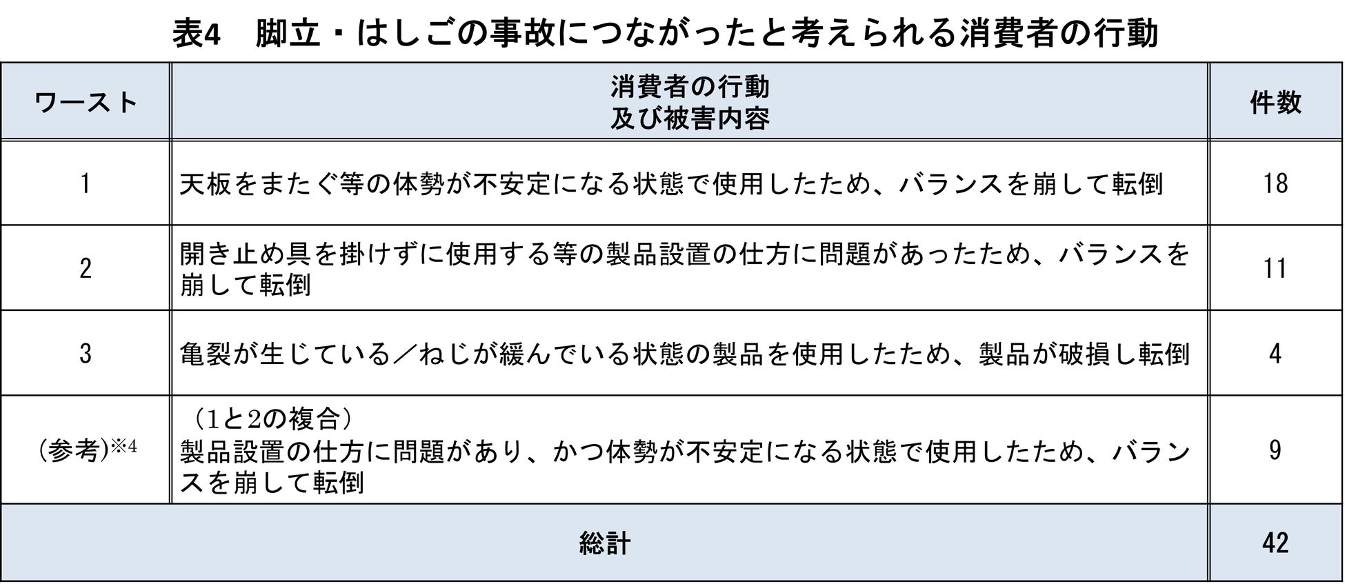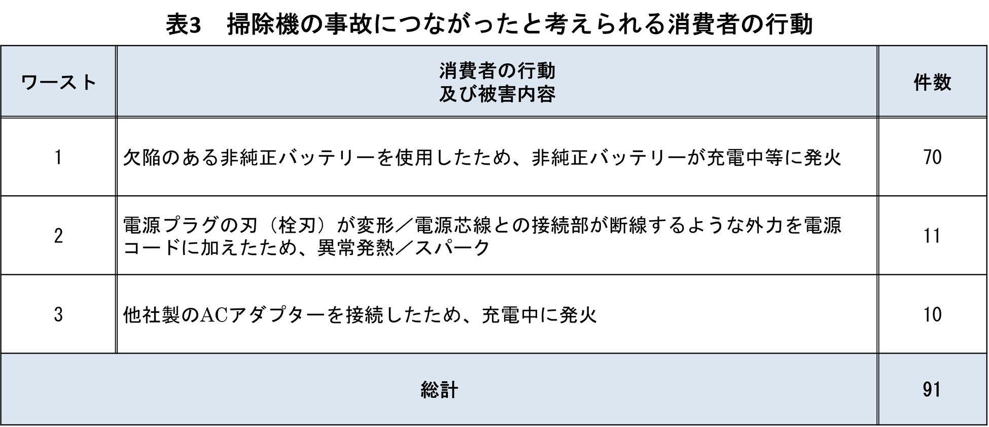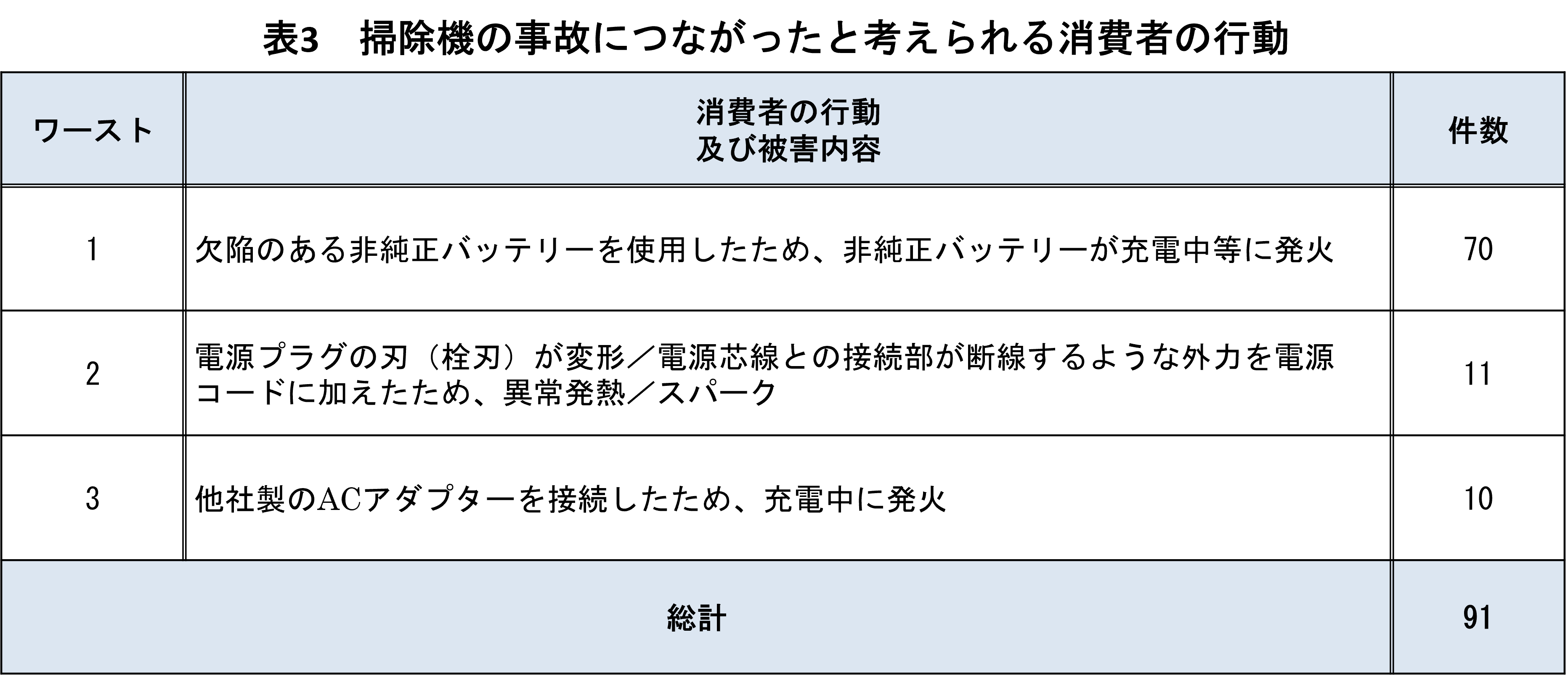 シュレッダーや掃除機、脚立・はしごの事故294件のうち、事故につながったと考えられる消費者の行動ワースト3を製品毎に表2、表3、表4に示します。特に、掃除機においては、充電中に非純正バッテリーが発火する事故が多く発生しています。