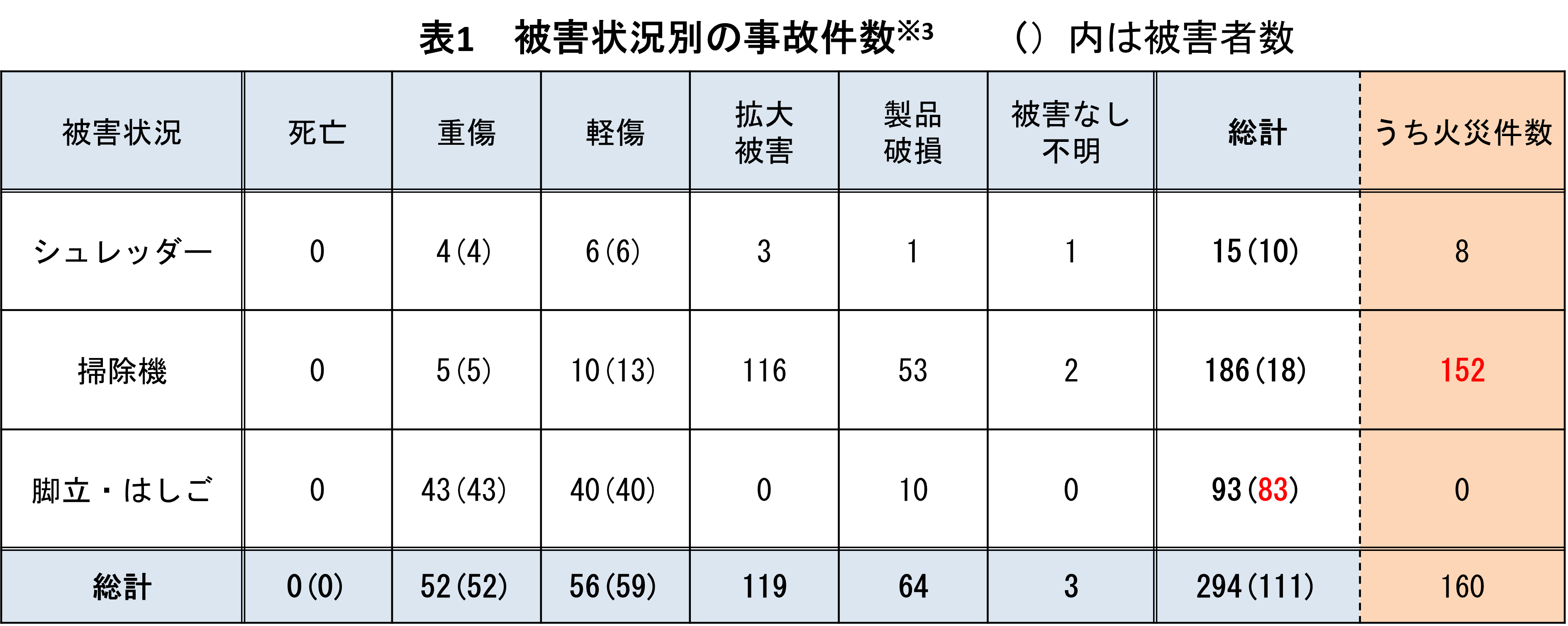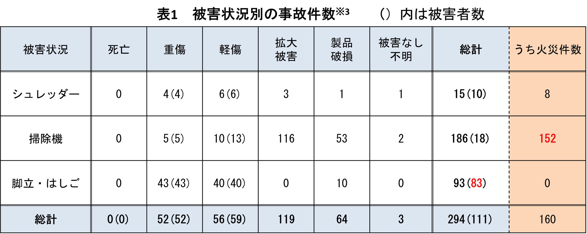 シュレッダーや掃除機、脚立・はしごの事故294件について、被害状況別の事故件数及び被害者数並びに火災件数を表1に示します。掃除機の事故の約8割が火災となっています。また、脚立・はしごの事故の約9割が人的被害に至っており大きな割合を占めています。