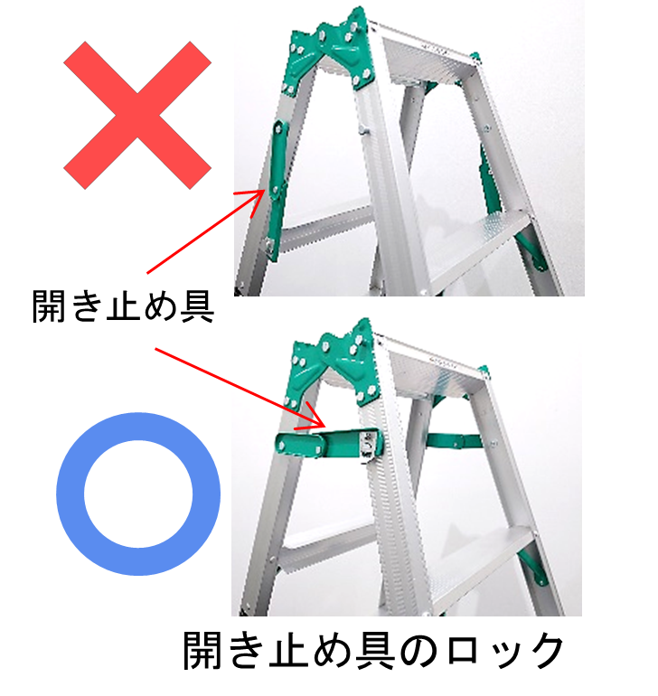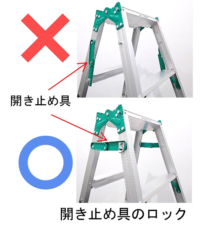 開き止め具のロックが不十分な状態で使用すると、使用時に開閉して転落するおそれがあるので、確実にロックした状態で使用してください。また、傾斜のある地面や柔らかい土の上、雨上がりの地面では、はしごや脚立が不安定になり転落するおそれが高くなるため、水平な地面の上で使用してください。