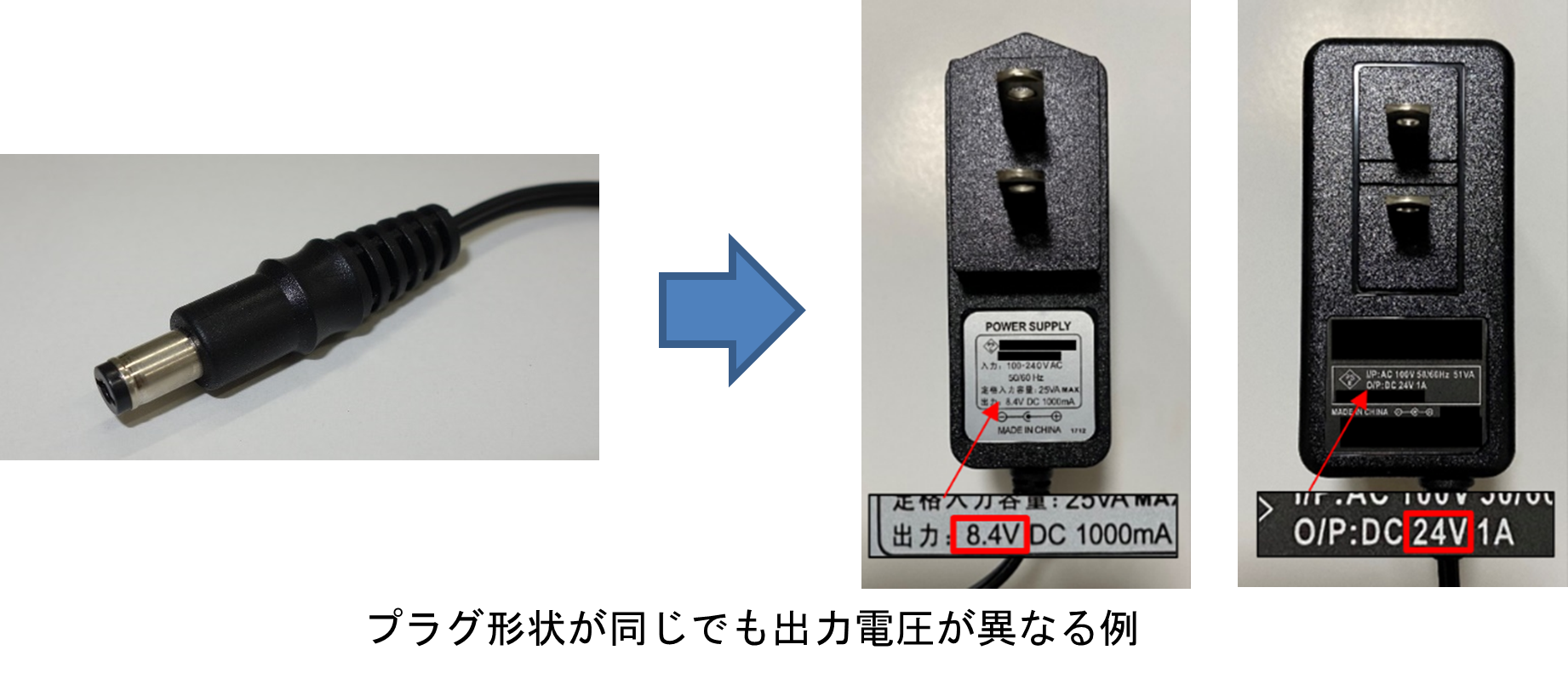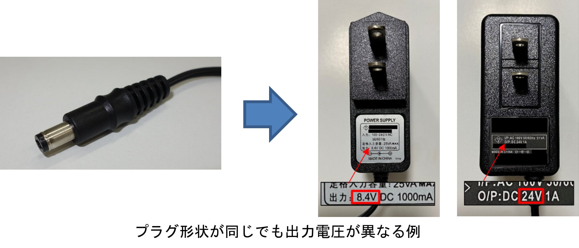 充電器(ACアダプター)は、機器それぞれに充電条件などの仕様が異なりますが、充電器と機器をつなぐプラグの形状は同じものもあり、他製品に付属していた充電器でも接続できてしまうことがあります。しかし、付属の充電器よりも高い電圧の充電器につないでしまうと、バッテリー内部のリチウムイオン電池が過充電状態となり、発火や破裂などの事故に至るおそれがあります。充電は付属の充電器で行ってください。