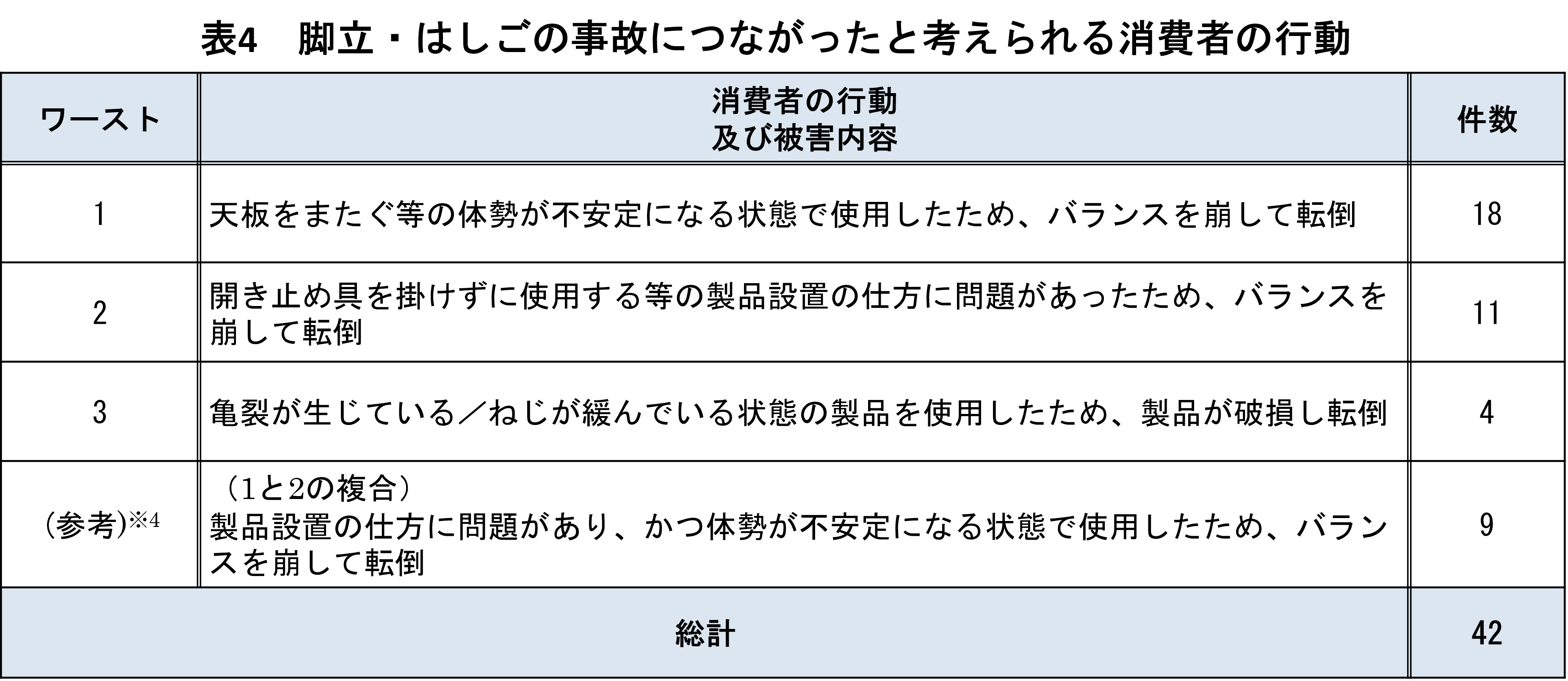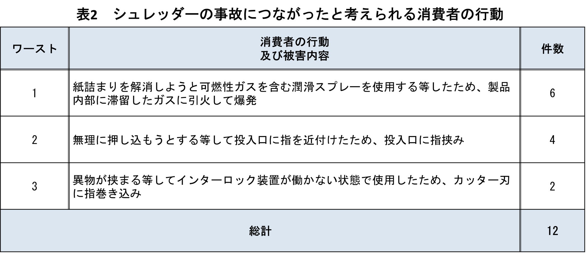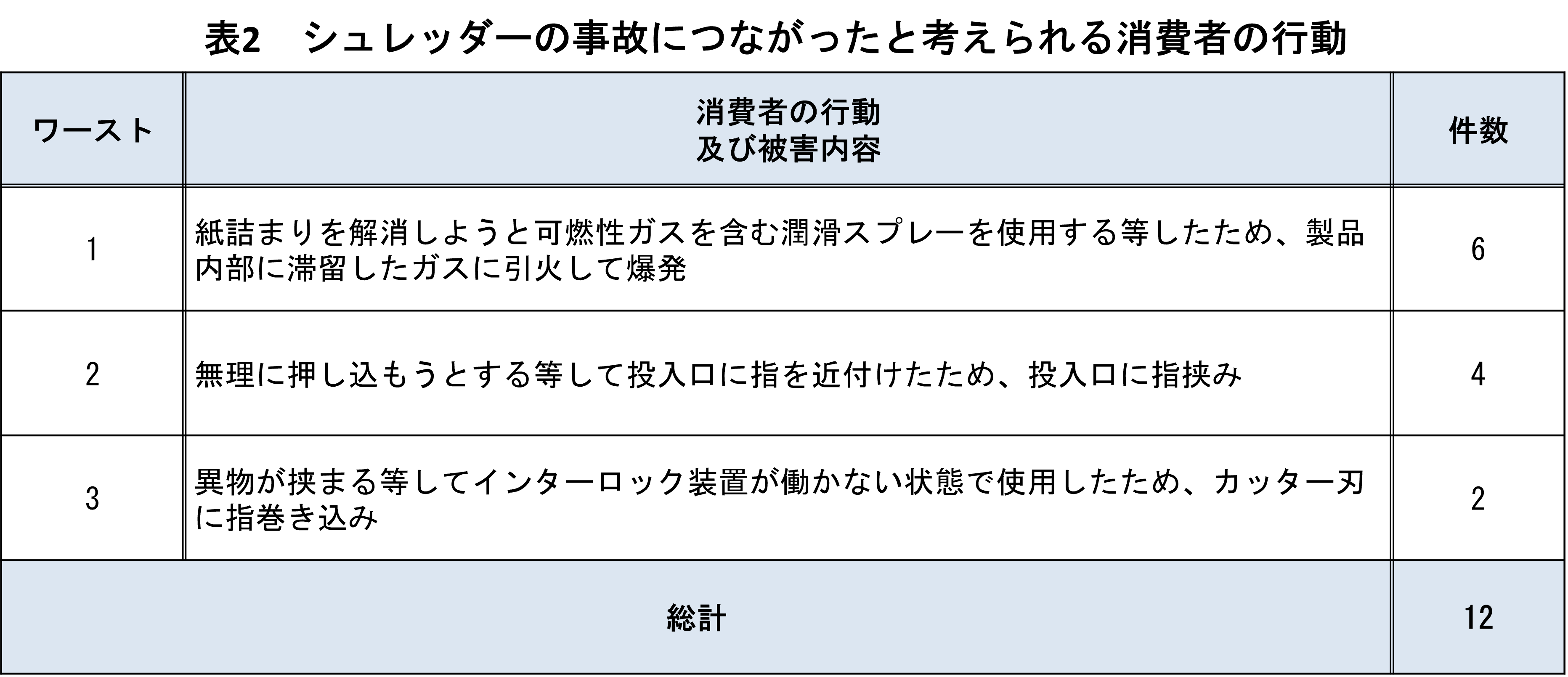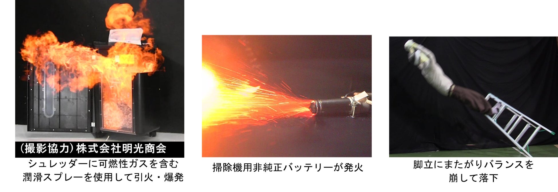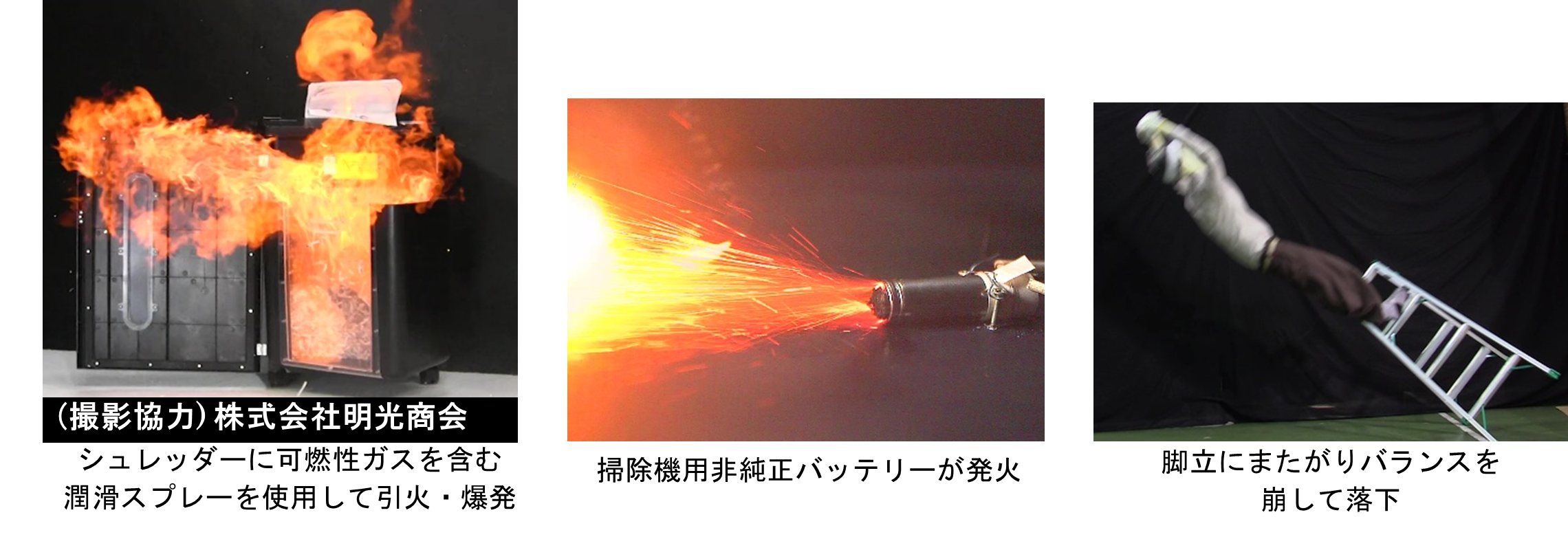 また、事故につながったと考えられる消費者の行動として、シュレッダーは「可燃性ガスを含む潤滑スプレー等を使用したため、製品内部に滞留したガスに引火して爆発」、掃除機は「欠陥のある非純正バッテリーを使用したため、非純正バッテリーが充電中等に発火」、脚立・はしごは「体勢が不安定になる状態で使用したため、バランスを崩して転倒」等がありました。