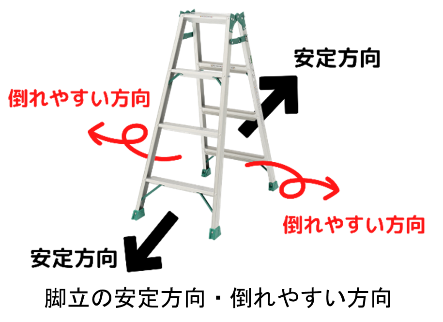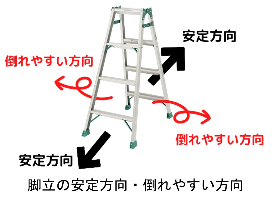 脚立には転倒しやすい方向があります。脚立にまたがると身体のバランスを崩しやすくなり、無防備な姿勢で倒れる可能性があり危険です。また、脚立は天板に乗ることが禁じられています。天板の上に乗ったり座ったりすると、身体のバランスを崩し転落するおそれがあります。必ず、本体表示及び取扱説明書に従って使用してください。