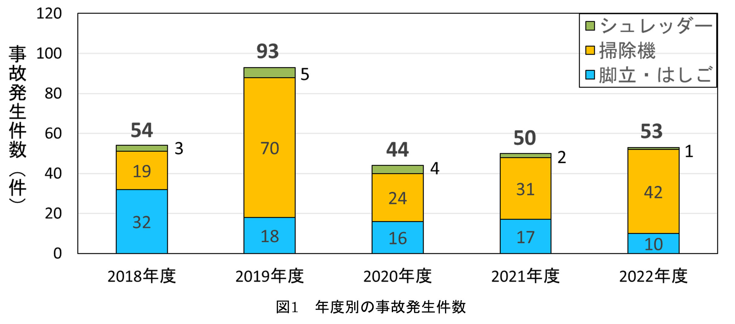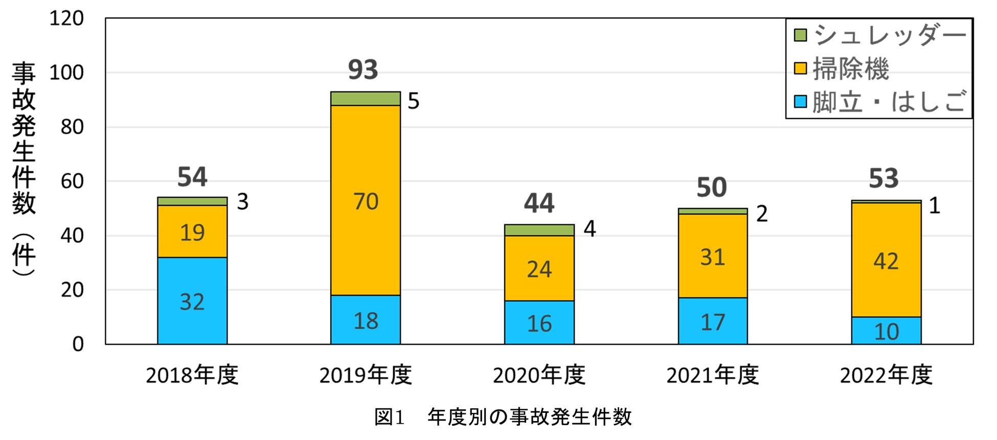 シュレッダーや掃除機、脚立・はしごの事故294件について、年度別の事故発生件数を図1に示します。2019年度は掃除機の非純正バッテリーが充電中に発火する事故が多発したため、件数が多くなっています。