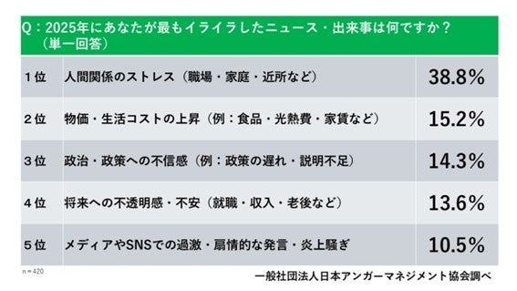 当協会が実施した「怒りとストレス実態調査」(全国20〜60代 男女420名)では、『2025年イライラ大賞』の2位に「物価・生活コストの上昇」(15.2%)がランクインしました。物価高や将来不安が、日常のイライラの背景になっていることがうかがえます。