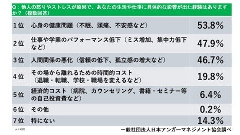 また、53.8%が「怒りやストレスが原因で、不眠・頭痛・不安などの心身の不調を経験した」と回答しており、怒り・ストレスが健康にも影響している実態が明らかになりました。