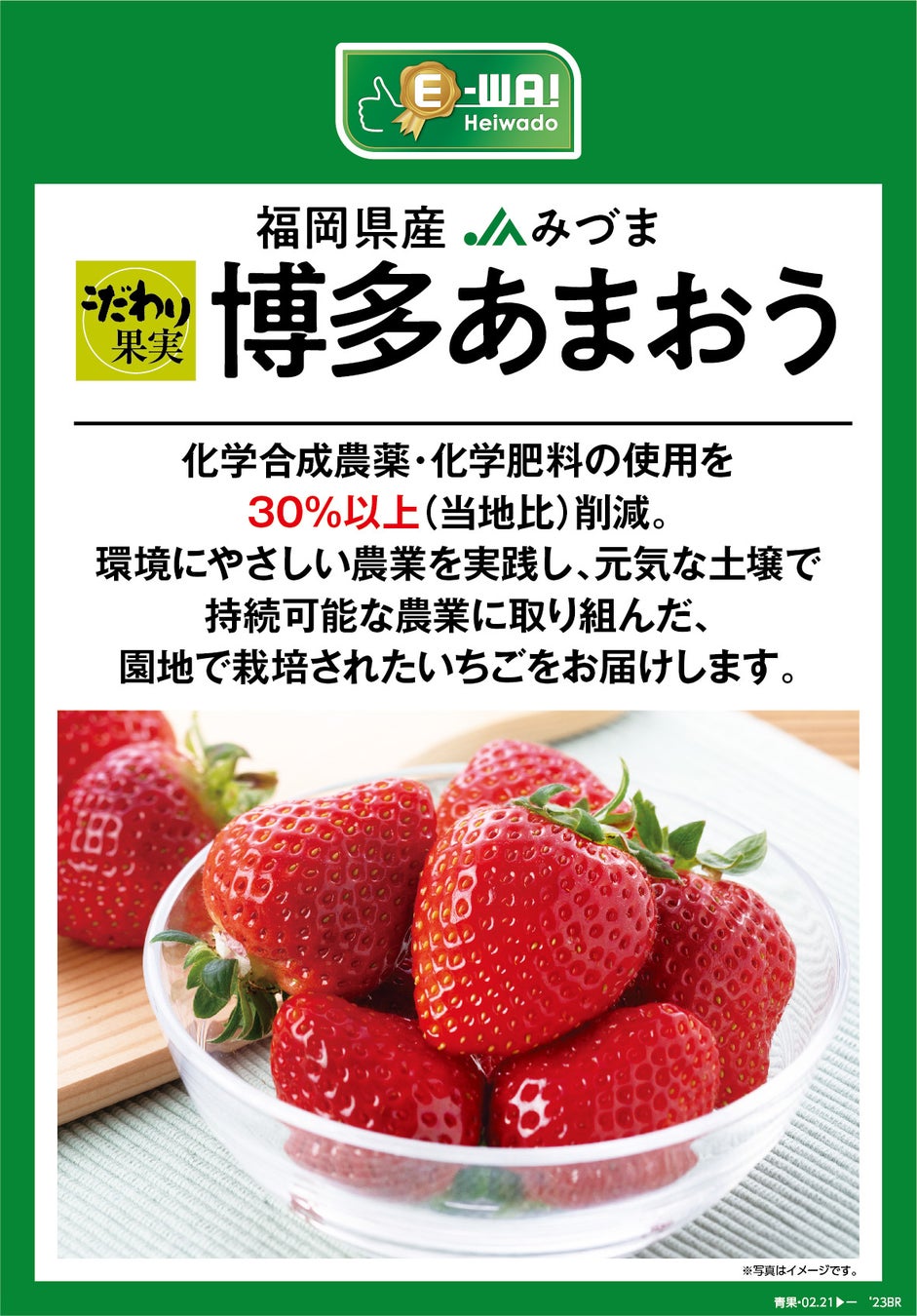 株式会社平和堂(本社:滋賀県彦根市、代表取締役社長執行役員:平松正嗣)は、平和堂こだわりブランドE-WA!の新商品として、「エコE-WA! こだわり果実 博多あまおういちご」を、2月22日(水)より平和堂「アル・プラザ」36店舗で発売します。