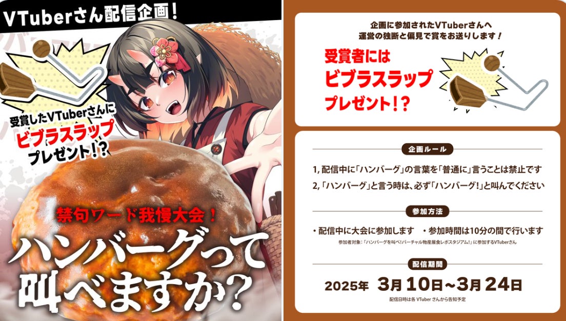 今回は3社のハンバーグ商品を取り扱いさせていただき、VTuberが生配信を通して視聴者に商品の魅力を発信する企画になっています。VTuberが配信で7種類のハンバーグ商品の食べ比べを行い、食レポを行う中で視聴者に商品の味や特徴などを伝えます。