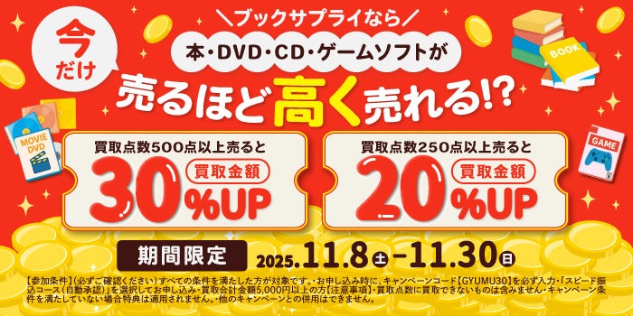 株式会社ブックサプライ(本社:大阪府吹田市、代表取締役:藪田真吾)は、2025年11月8日(土)~11月30日(日)の期間限定で、「売るほど高く売れる!買取金額最大30%UPキャンペーン」を開催いたします。