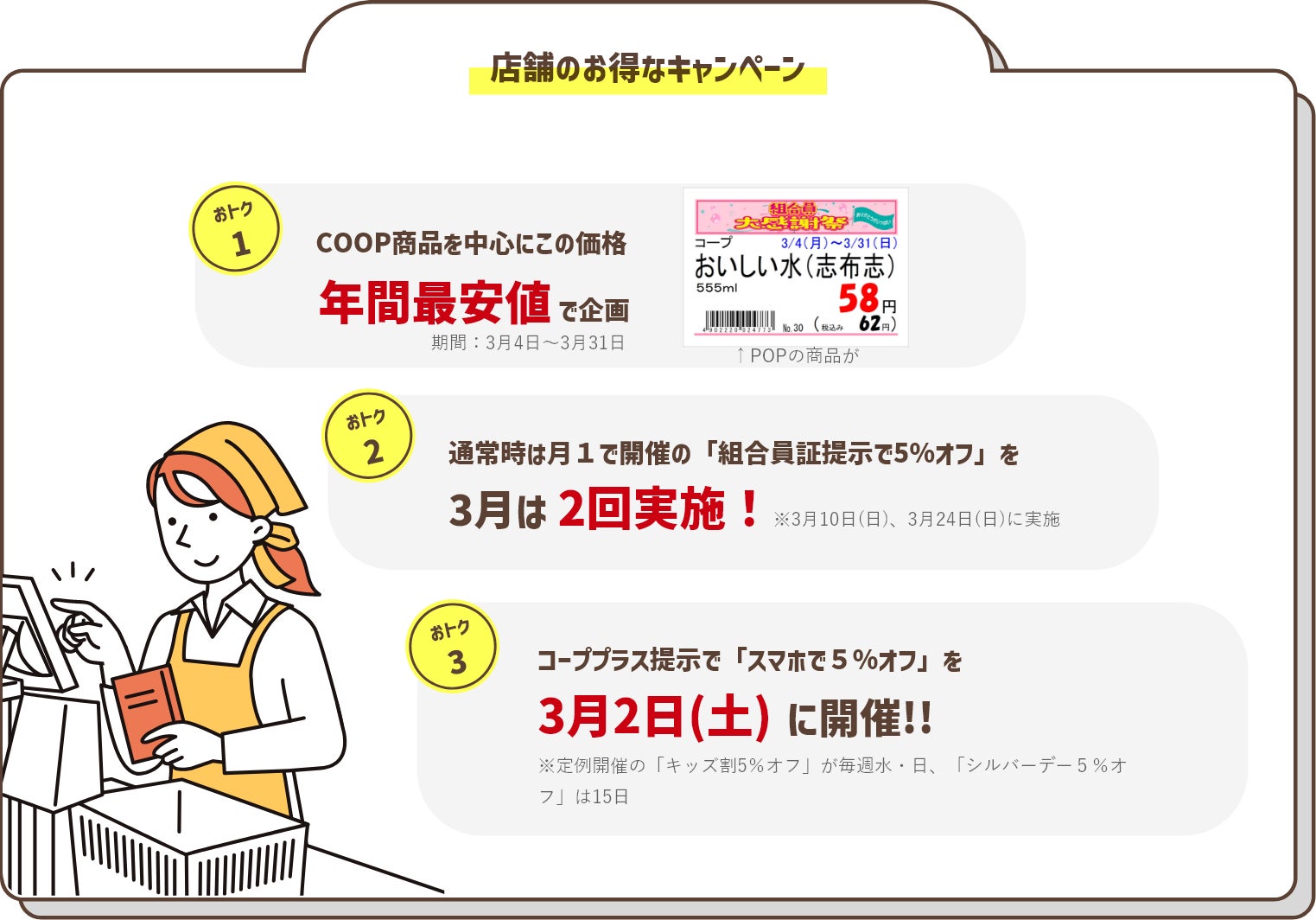 2.通常時は月1回で開催の「組合員証提示で5%オフ」を3月は2回実施