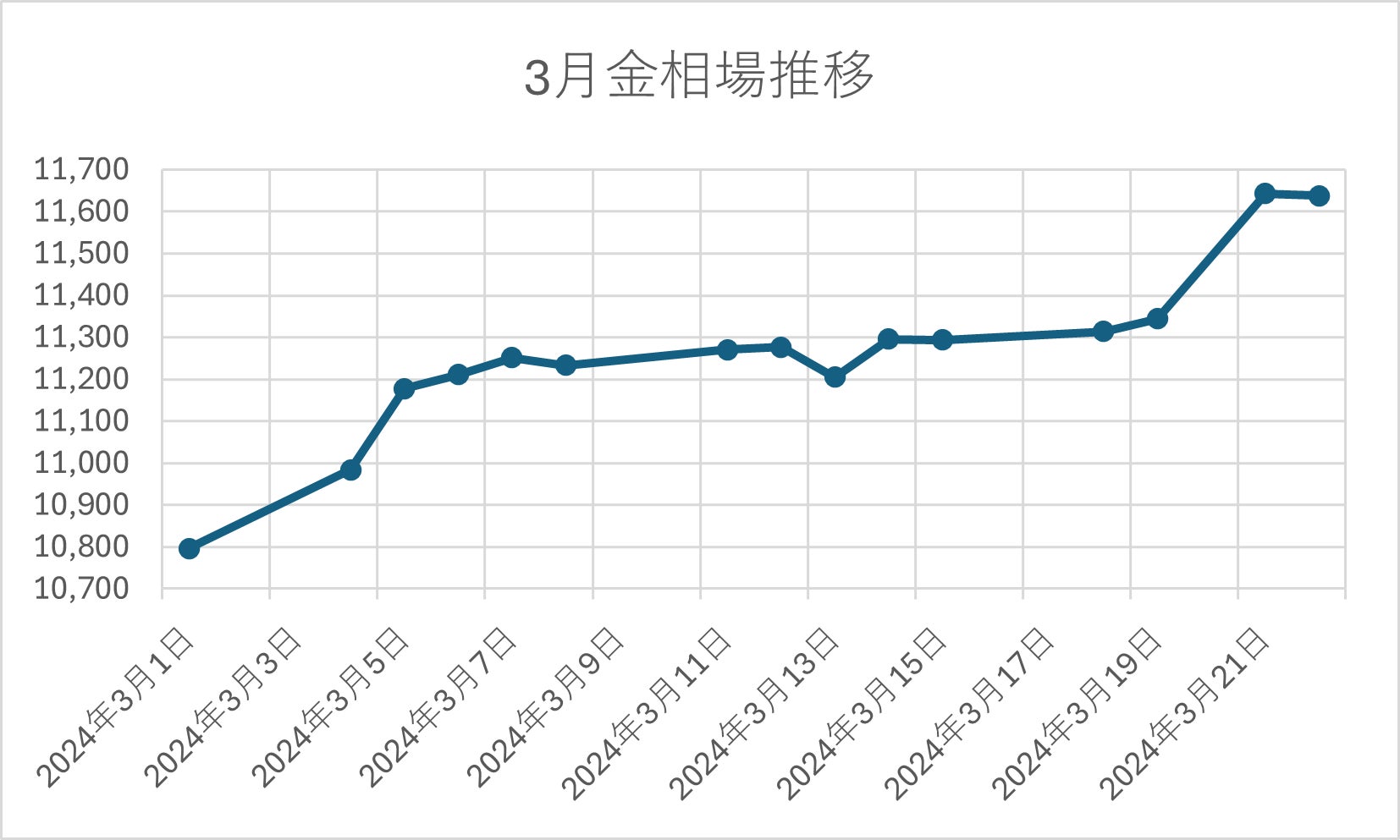 2月19日時点での金国内買取価格は10,644円でしたが、3月21日には1gあたり11,643円まで急上昇。およそひと月の間で相場が+1,000円の価格上げは非常に稀なケースです。特に3月21日は前日比+299円(11,643円/g)は更なる金価格続伸の前触れのように感じます。