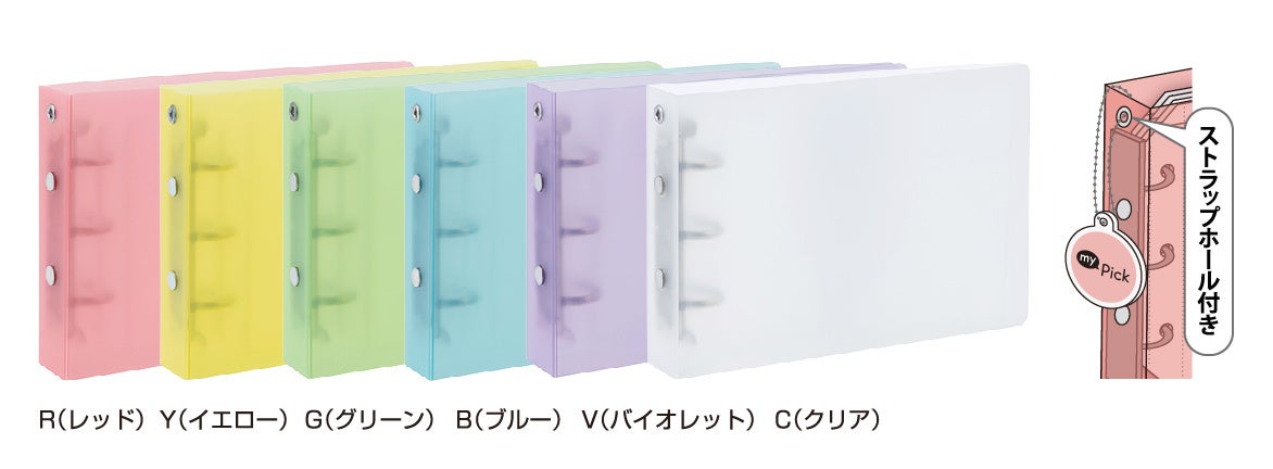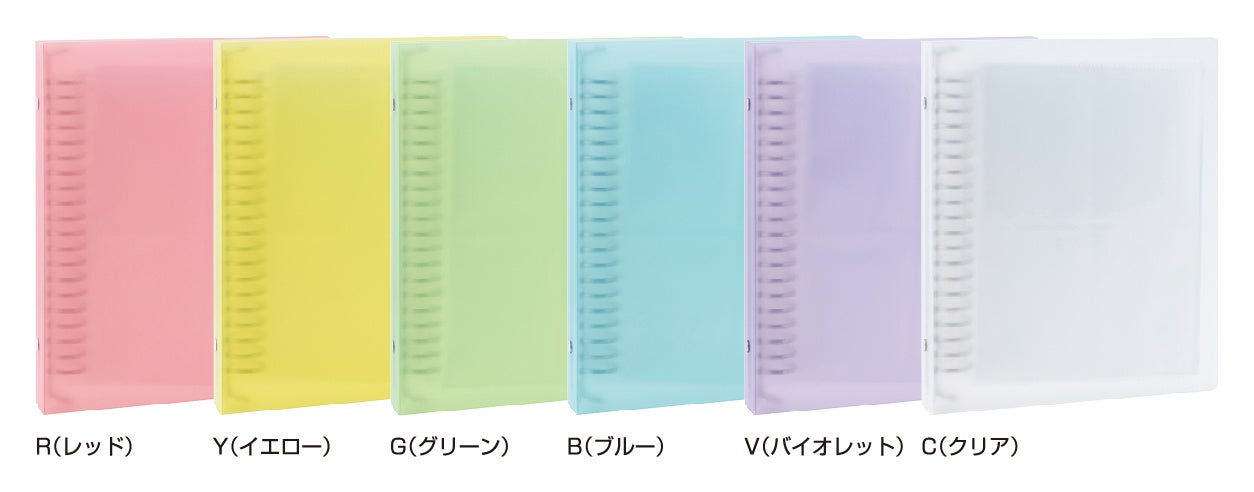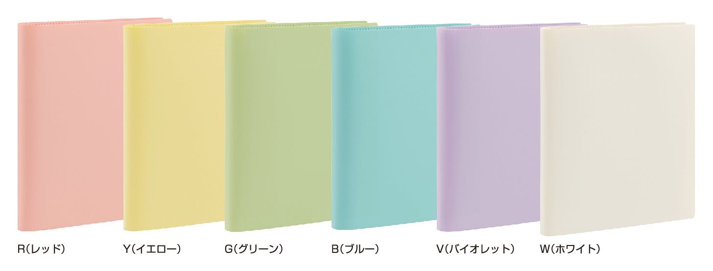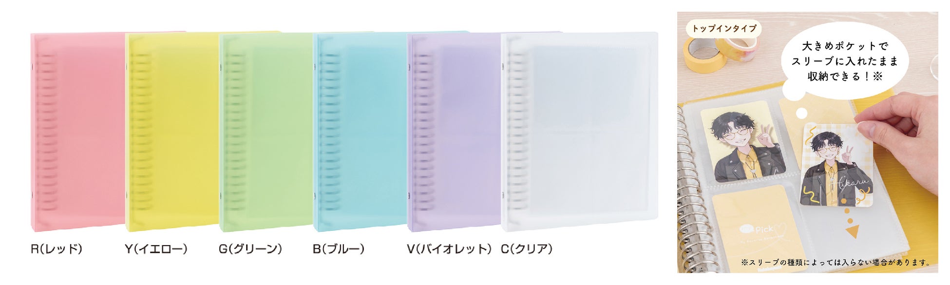 (R)レッド、(Y)イエロー、(G)グリーン、(B)ブルー、 (V)バイオレット、(C)クリア(バインダータイプのみ)、 (W)ホワイト(トレカブックのみ) |