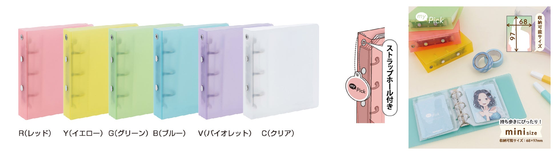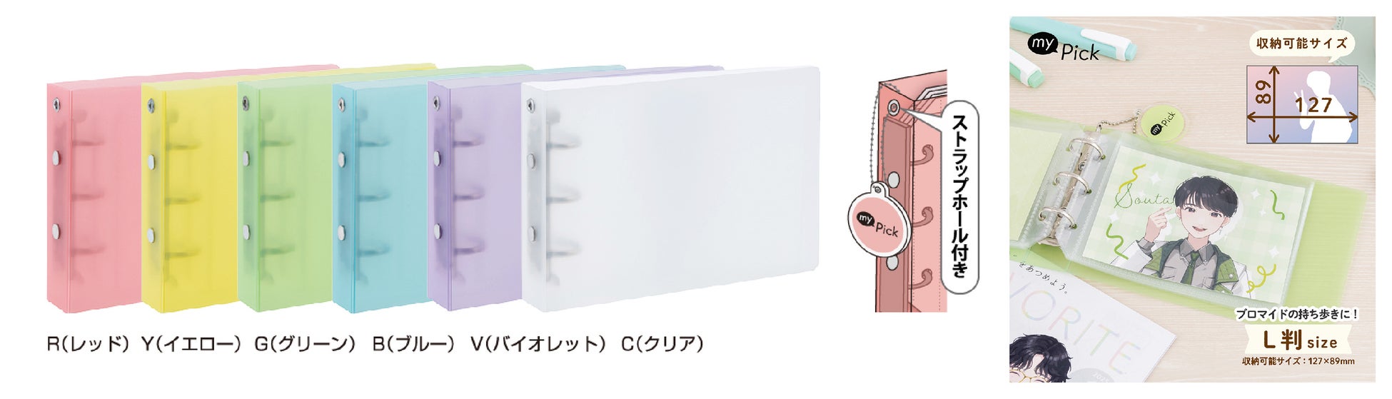お気に入りの写真やブロマイドを持ち運ぶのに便利なポケットサイズのバインダーアルバムです。内容物が透けて自分好みにカスタマイズができるクリア表紙を採用しました。キーホルダーが付けられるストラップホール付き。