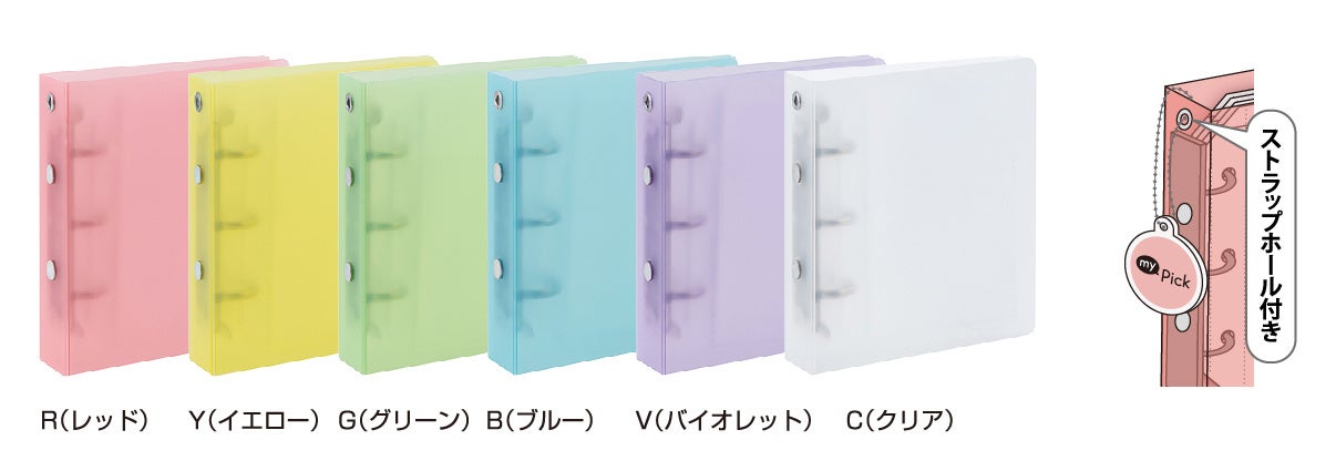 カラーはレッド、イエロー、グリーン、ブルー、バイオレット、クリアまたはホワイトの6色展開です。表紙は、バインダータイプには透けてカスタマイズ可能なクリアカラー、ブックタイプには中身が見えないミルキーカラーを採用しました。推しのメンバーカラーや、キャラクターのイメージカラーなどに合わせて選ぶことができ、お気に入りのトレカや写真を1冊に集められます。